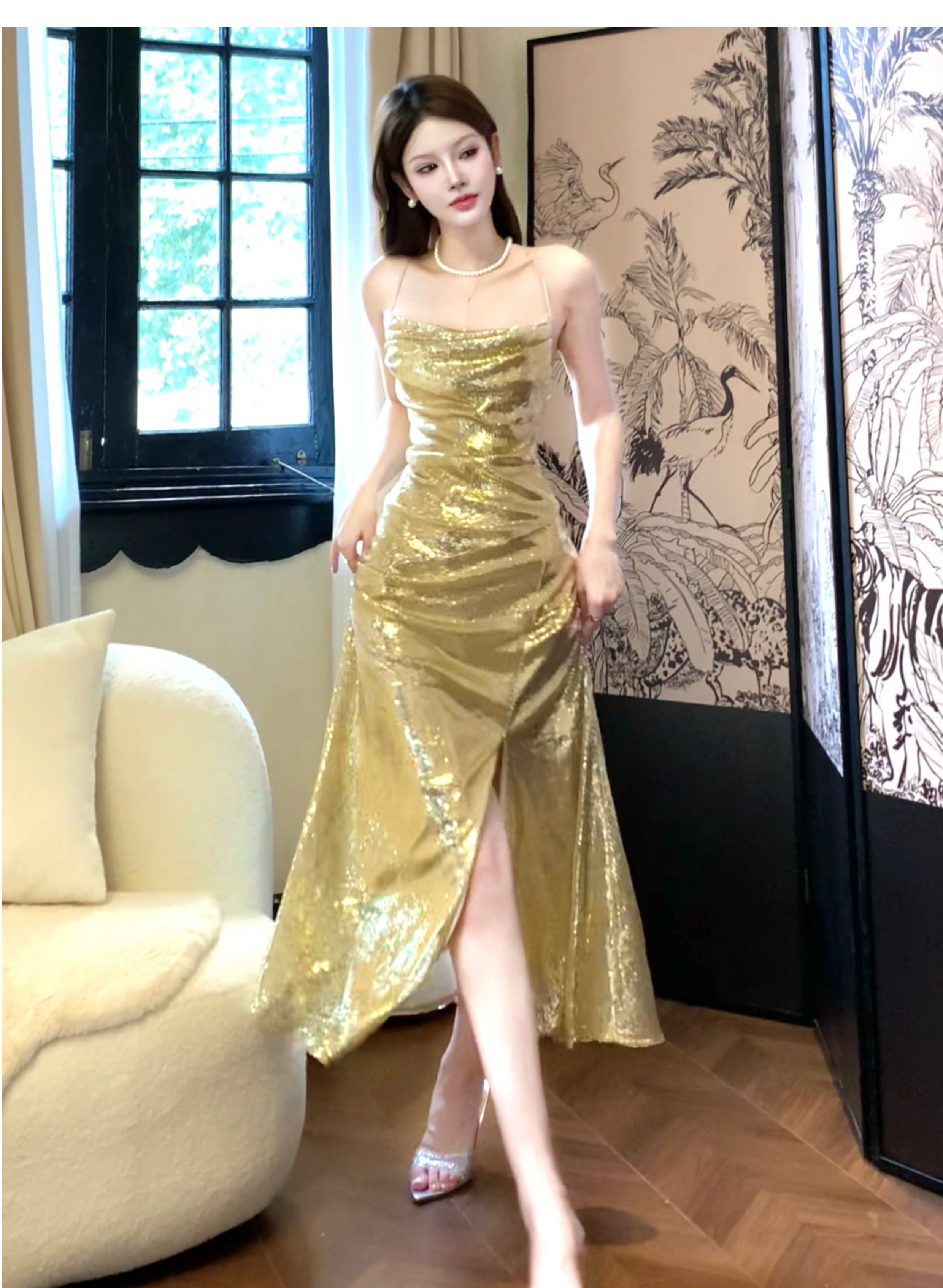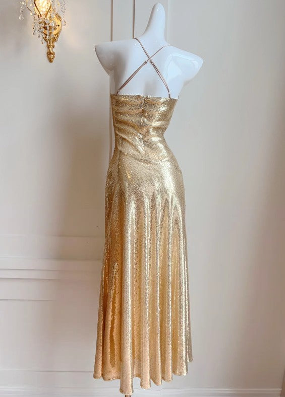 Elegant Gold Sequin Spaghetti Strap A-Line Evening Dress Backless Sparkling Birthday Party Dress HZ1108