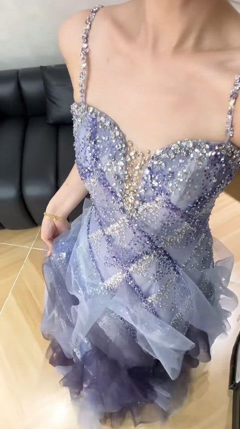 Fairytale Spaghetti Straps Sequins Tulle A-Line Long Prom Dresses Sweet 16 Evening Gowns HZ1108