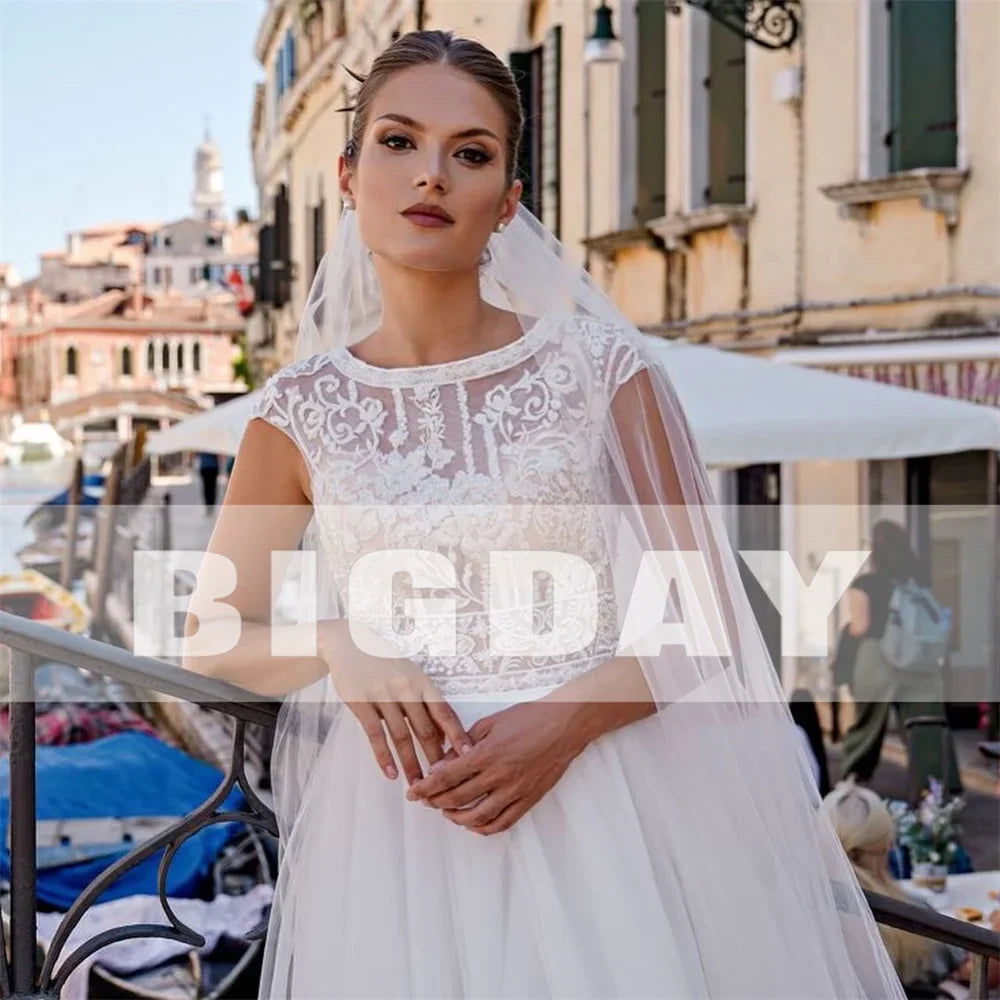 Runhufu A-Line Wedding Dresses Women 2024 Lace O-Neck Cap Sleeve Split Tulle Open Back Bridal Gown Sweep Train Vestidos De Noiva