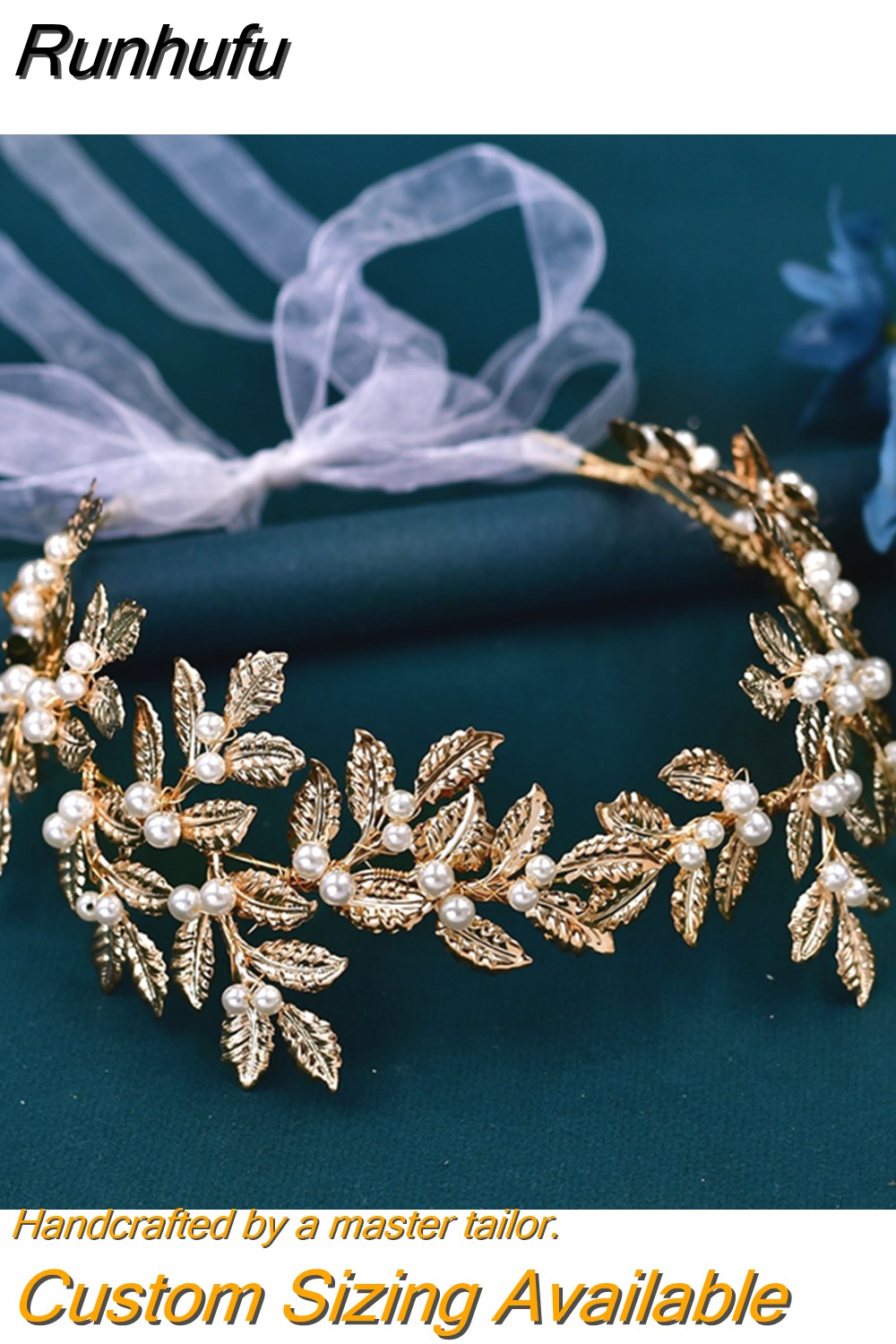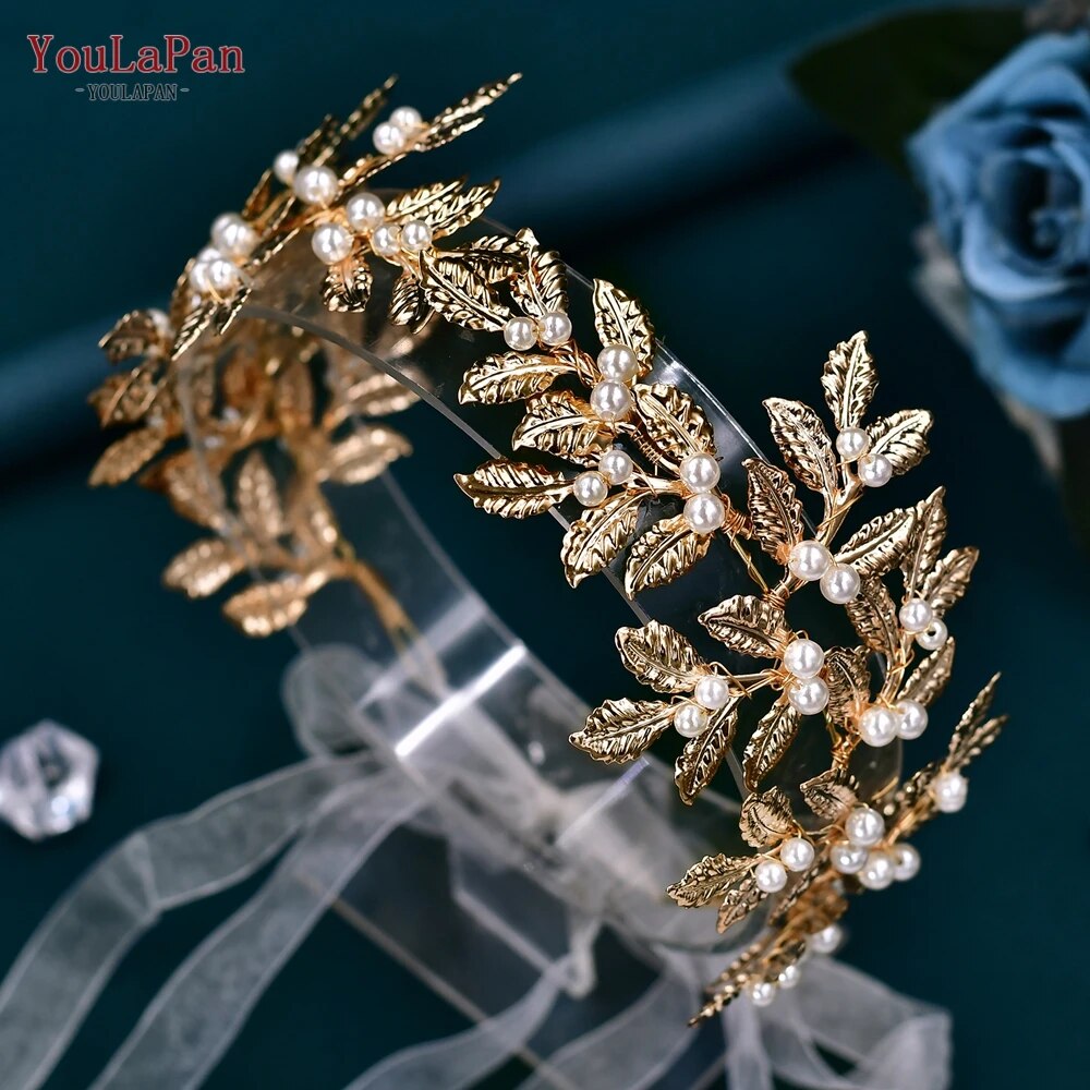 Runhufu Alloy Leaf Tiara for Woman Pearls Bridal Headband Wedding Hair Accessories Handmade Girl Headpiece with Organza HP353