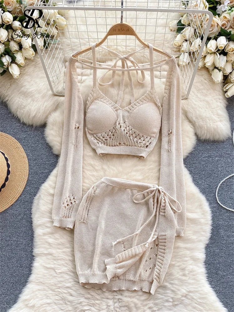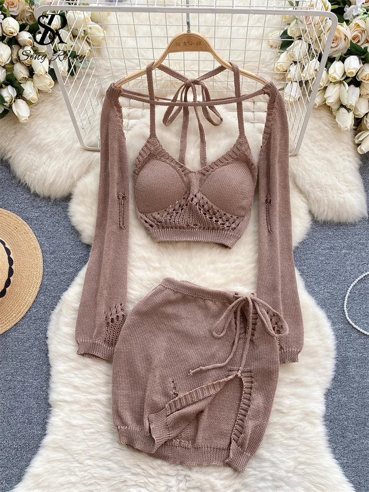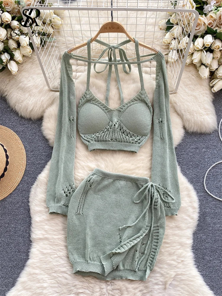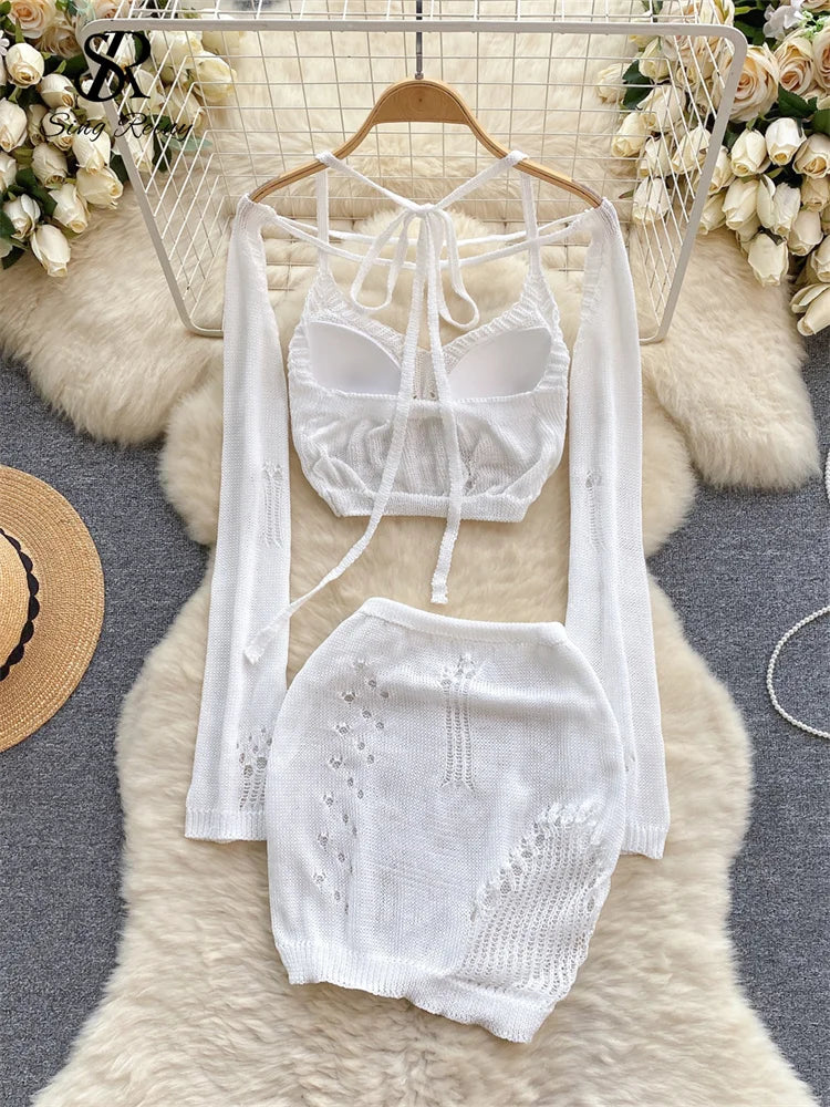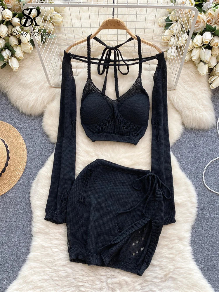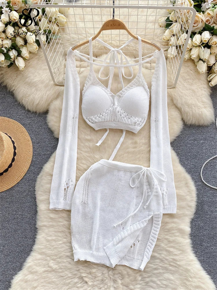 Runhufu American Sexy Suits Hollow Out Long Sleeve Halter Mini Top+Slim Bodycon Skirt 2024 Y2K Summer Beach Style Knitted Sets