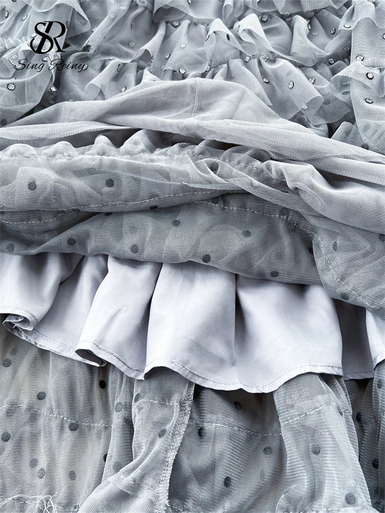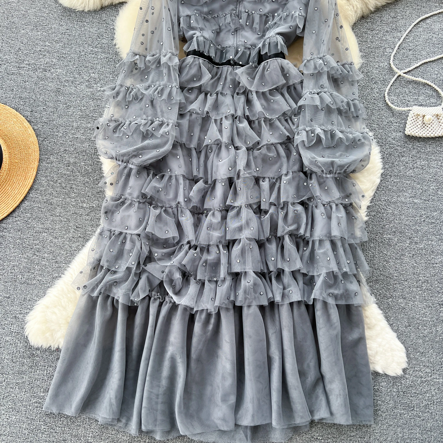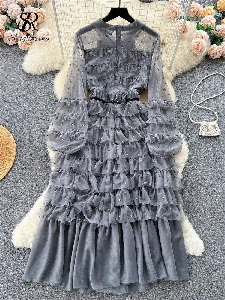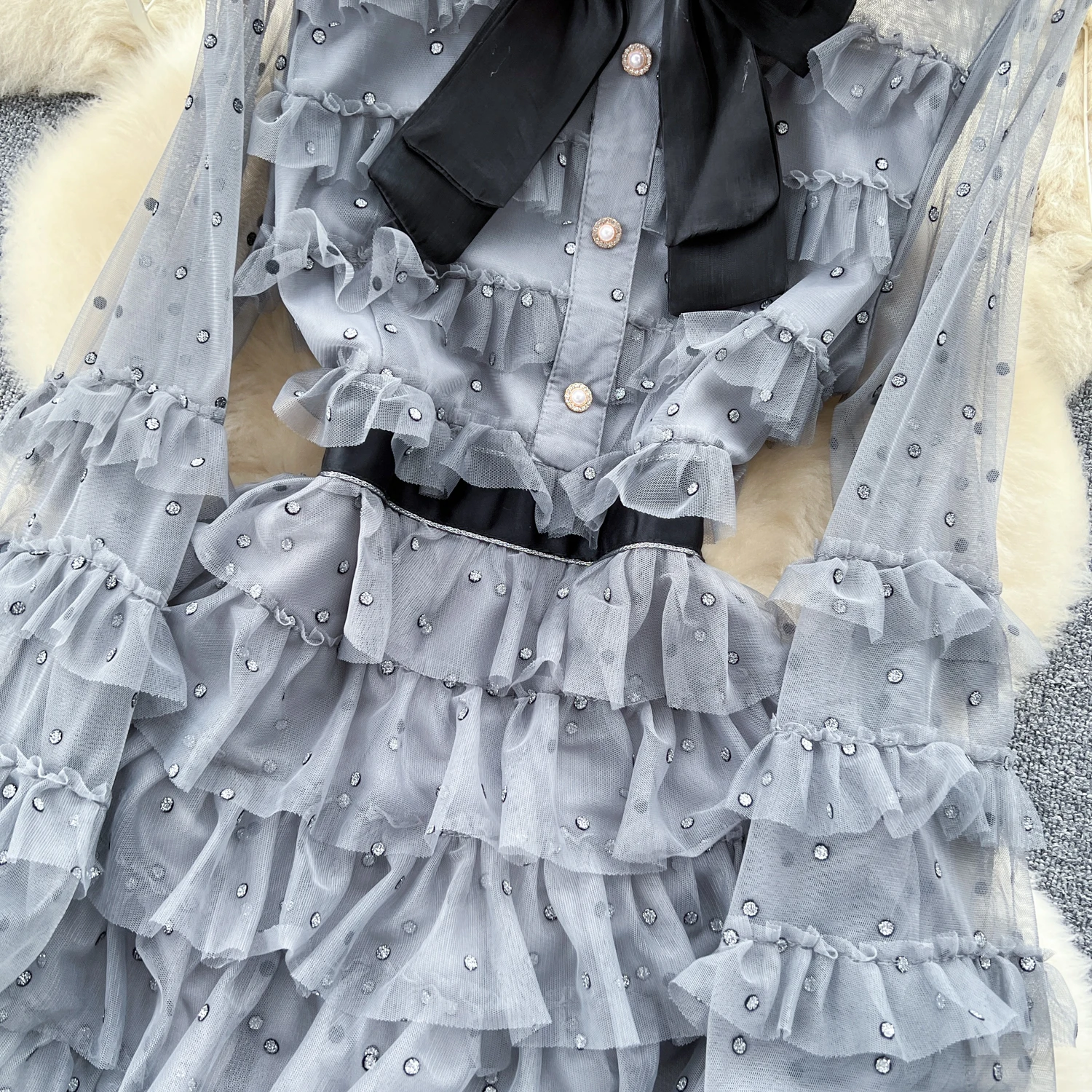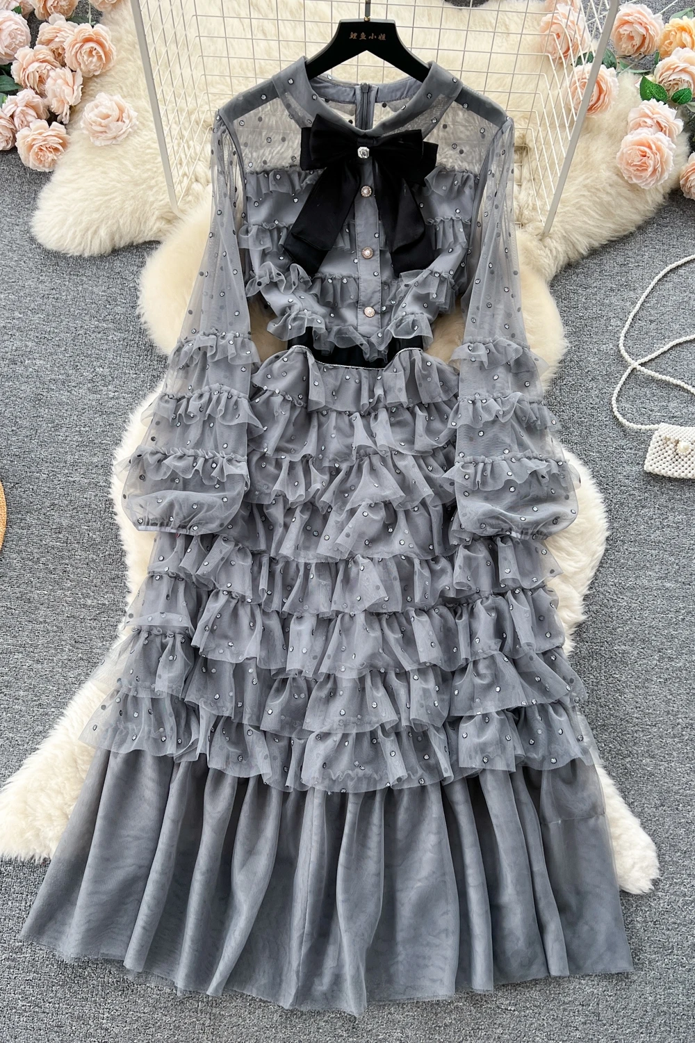 Runhufu Autumn Sweet Cake Dress Transparent Belt 2024 O Neck French Bow Design Diamonds Mesh Gentle Temperament Long Dress