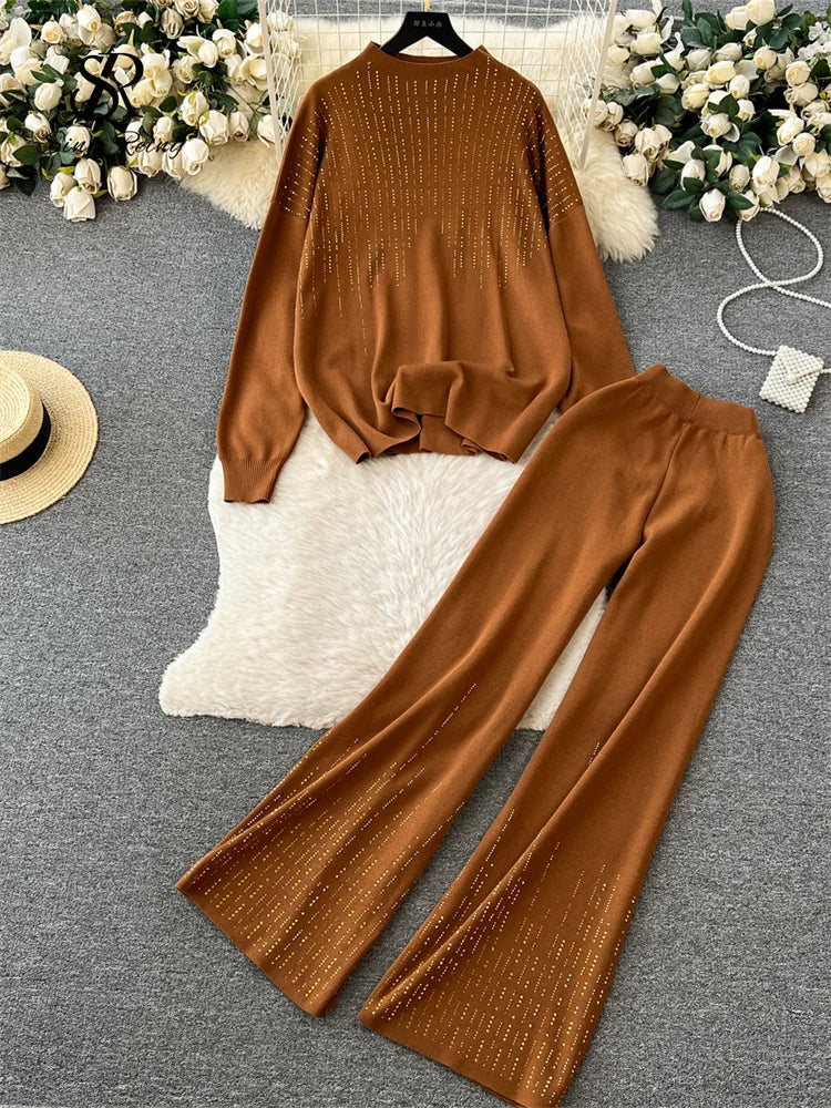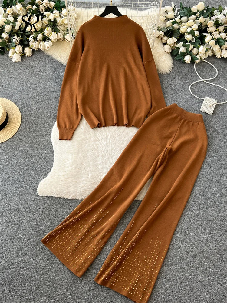 Runhufu Beadings Design Loose Knitted Sets Female O Neck Pullover+Wide Legs Long Pants Fashion Casual Oversize Sweater Suits
