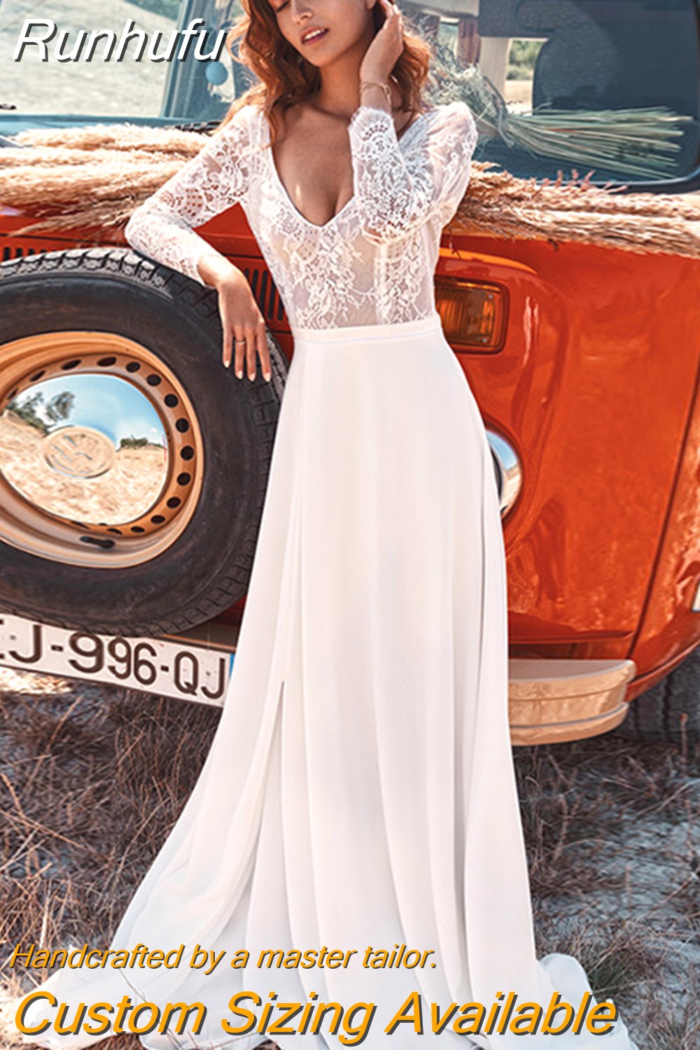 Runhufu Boho Backless Wedding Dresses Chiffon Long Sleeves Lace Floor Length Robe De Mariee Elegant Beach Simple Ivory Bridal Gowns