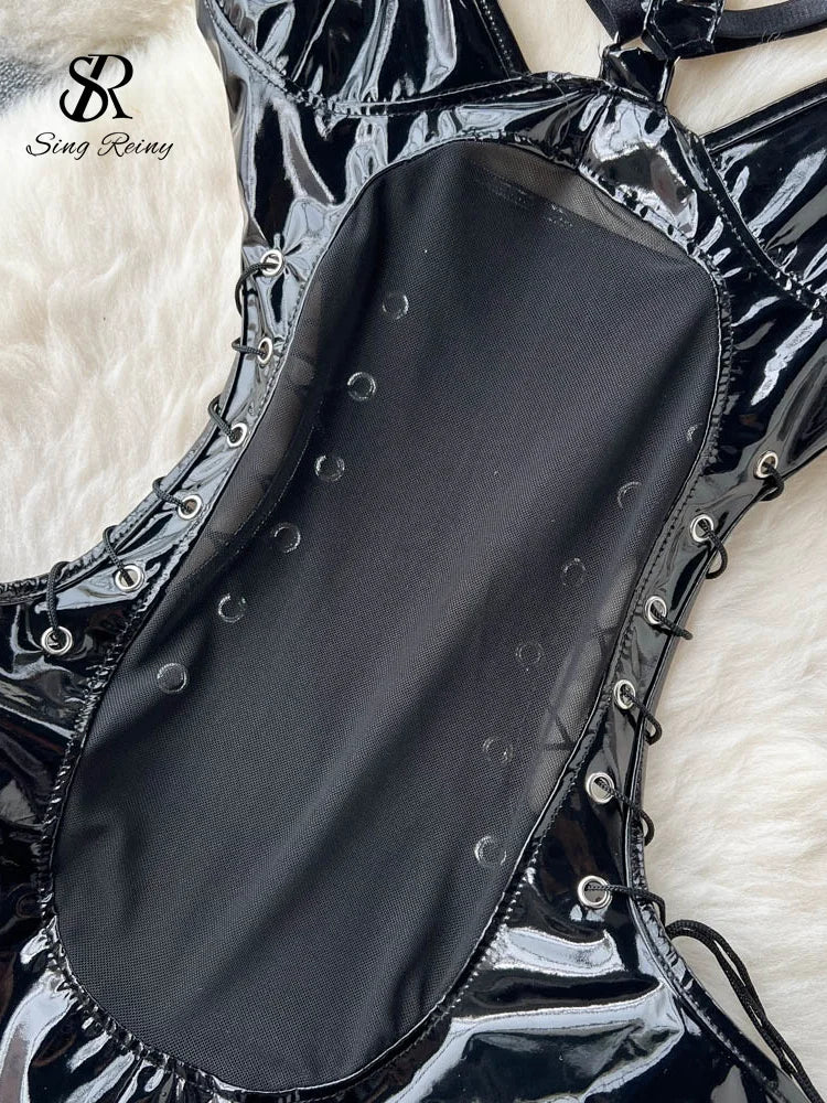 Runhufu Drawstring PU Leather Sexy Playsuits Women Lace-up Design Sheath Rompers Spliced Mesh Summer Halter Fashion Bodysuits