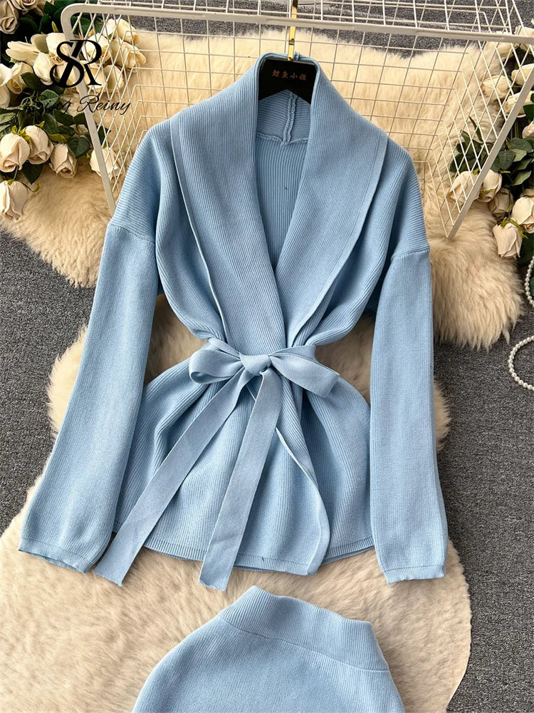 Runhufu Fashion Blue Knitted Three Pieces Sets Women Lace Up Warm Cardigans+Camis+Long Skirt 2024 Elegant Thick Sweater Suits
