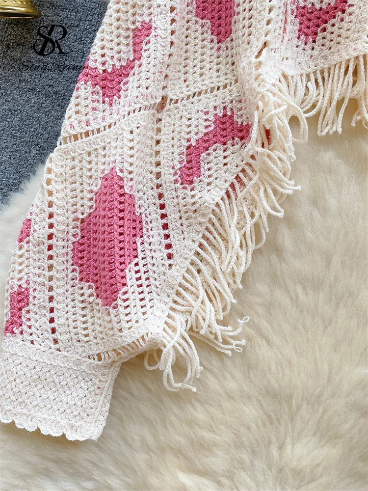 Runhufu Fashion Tie-Dye Autumn Top Women O Neck Long Sleeves Tassel Hollow Out Loose Blouse Streetwear Beach Knitted Shirt