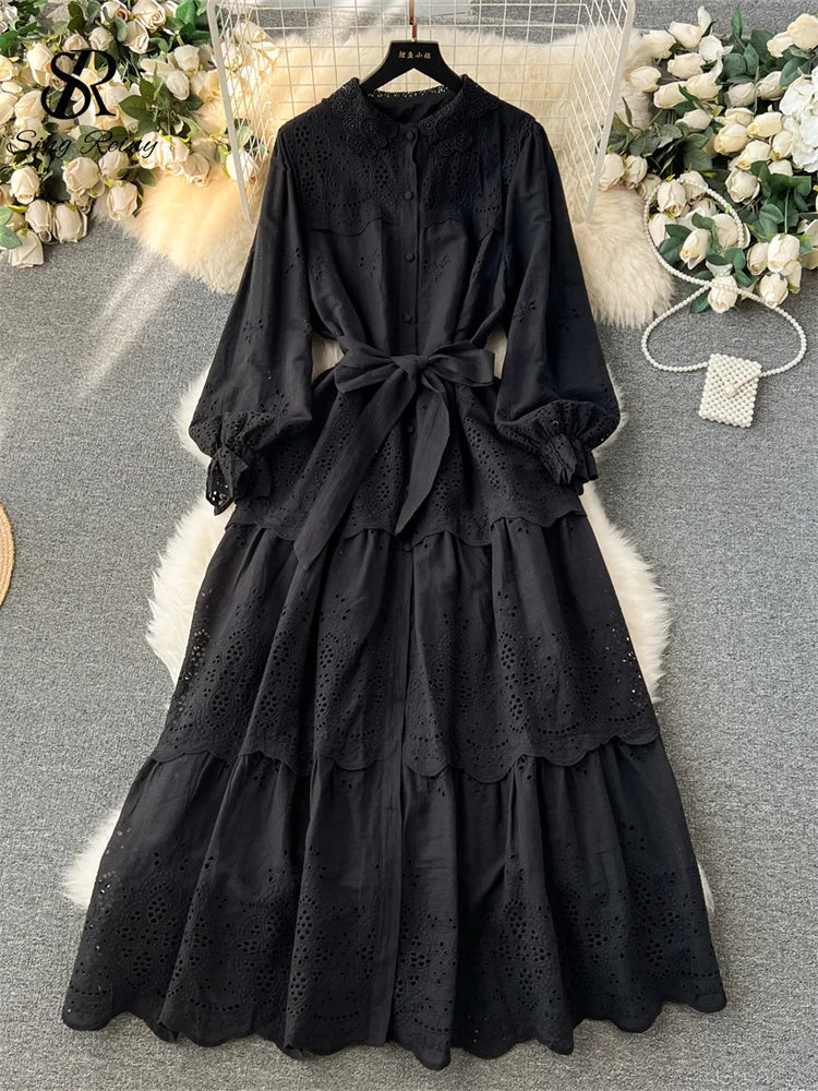 Runhufu French Hotsweet Long Dress Women O Neck Lantern Sleeve Fashion Single Breasted Lace up Design Embroidery Lace Dress