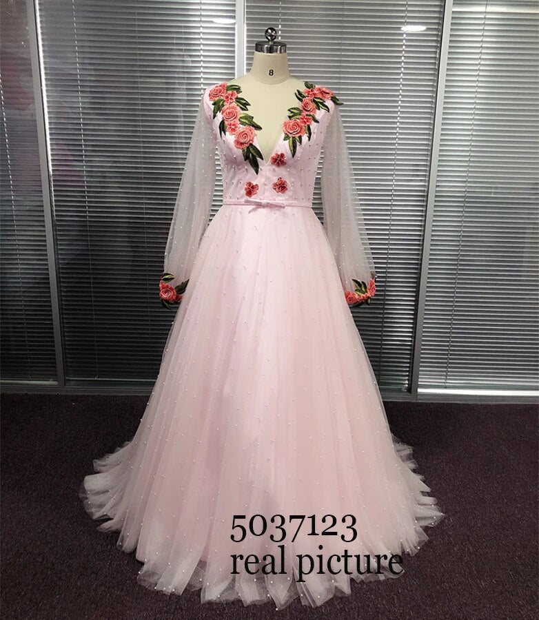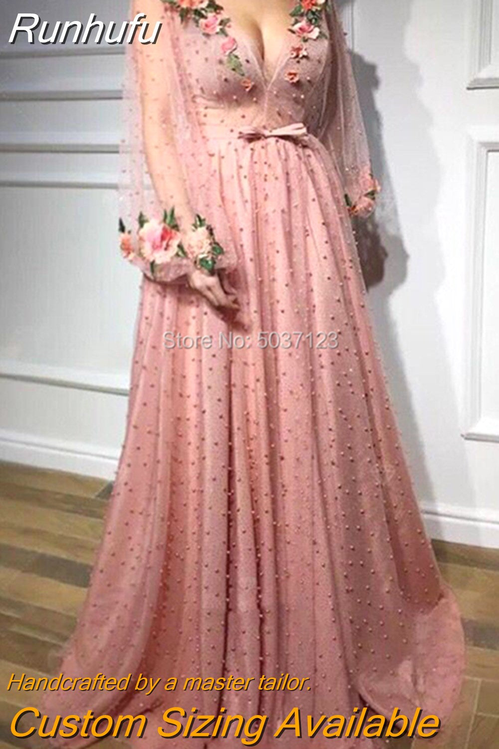 Runhufu Full Beads Long Evening Dresses Lace Appliques 3D Flowers V-Neckline Full Sleeves Floor Length Evening Formal Party Gowns