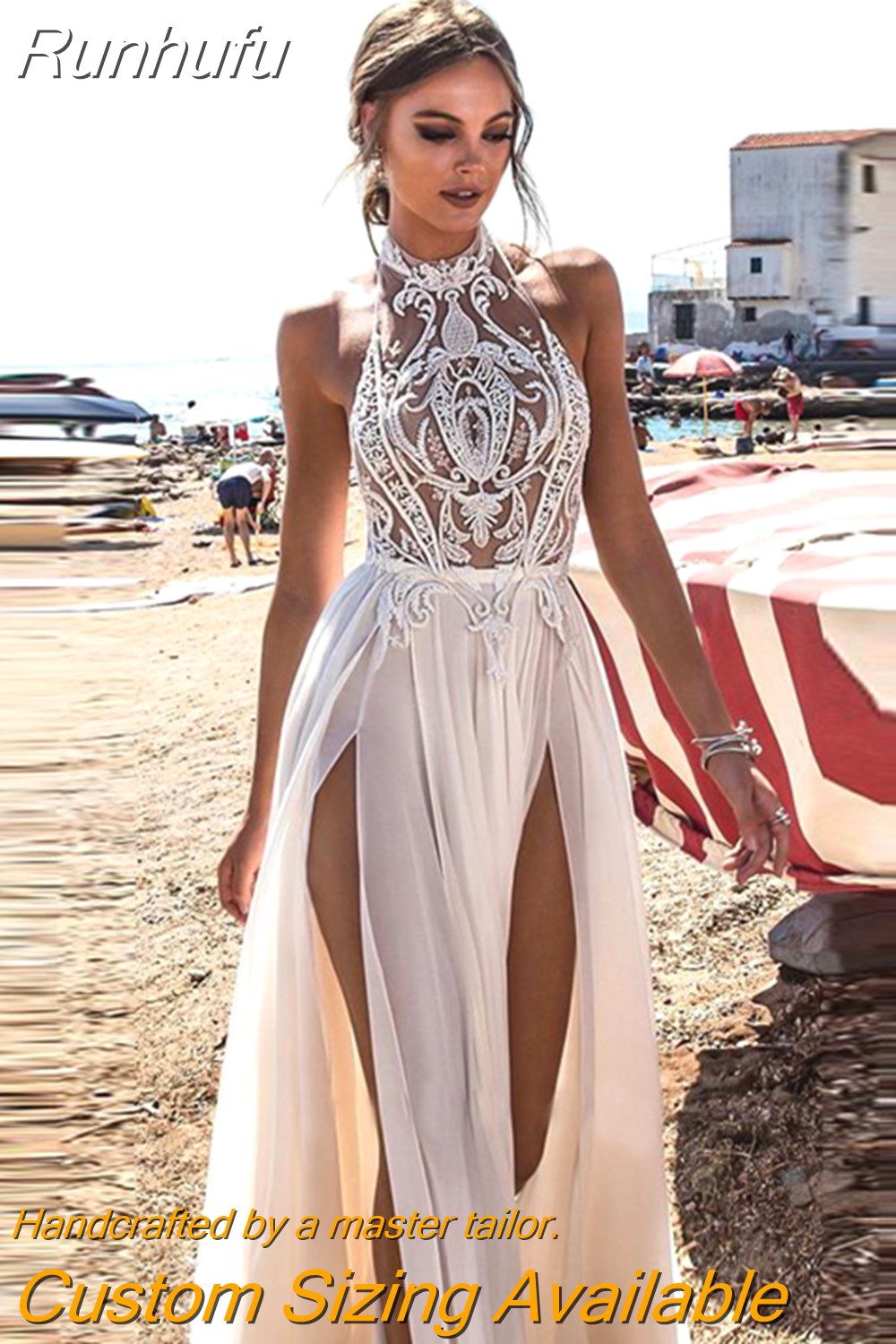 Runhufu High Side Slit Halter Beach 2023 Wedding Dress Boho Lace Top Chiffon Skirt Long Backless Bridal Gown for Women Vestido