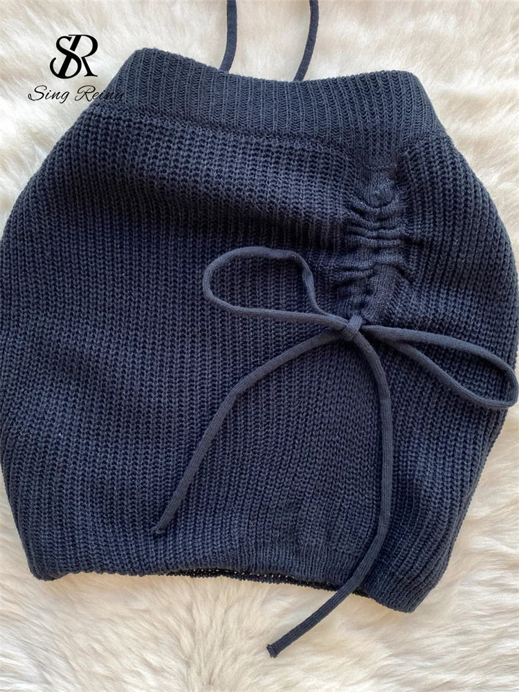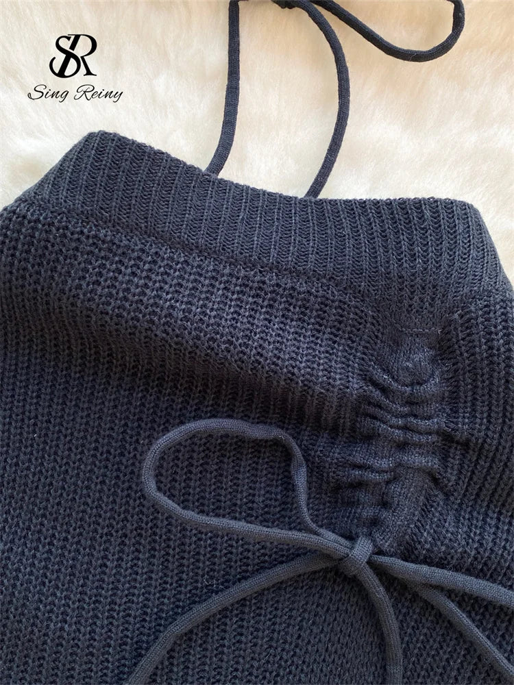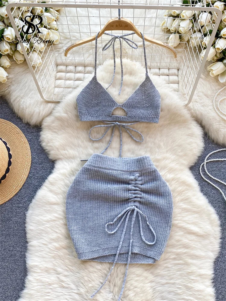 Runhufu Hotsweet Female Beach Suits Strapless Halter Sexy Camis+Drawstring Basics Slim Skirt Fashion Knitted Two Pieces Suit