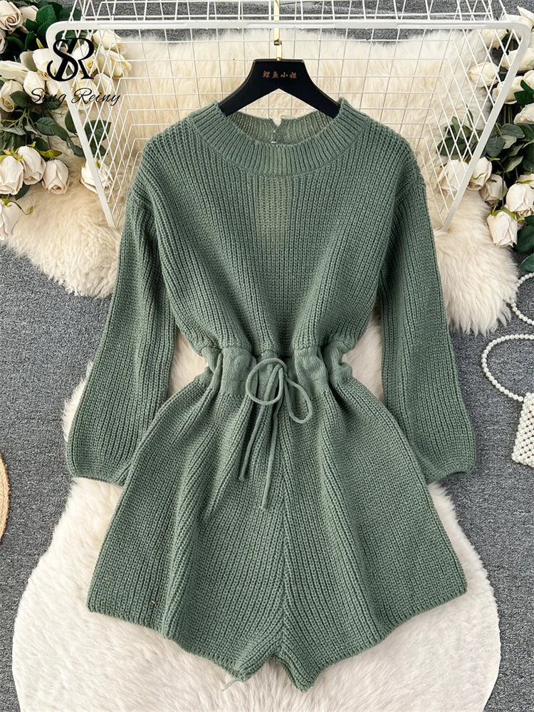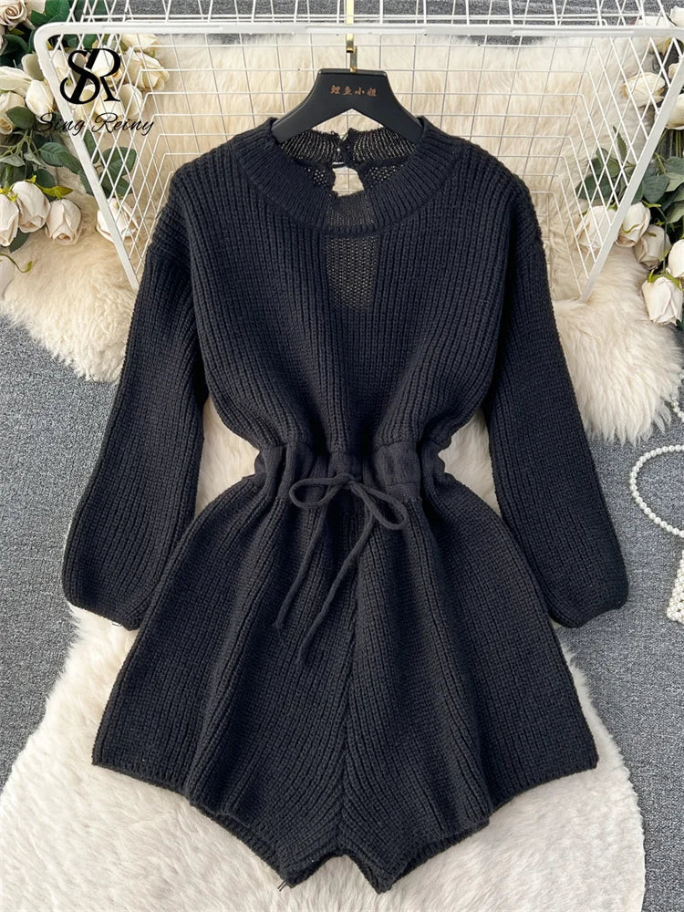 Runhufu Korean Style Casual Bodysuits O Neck Long Sleeves Hollow Out Backless Drawstring Elastic Waist Women Shorts Jumpsuits