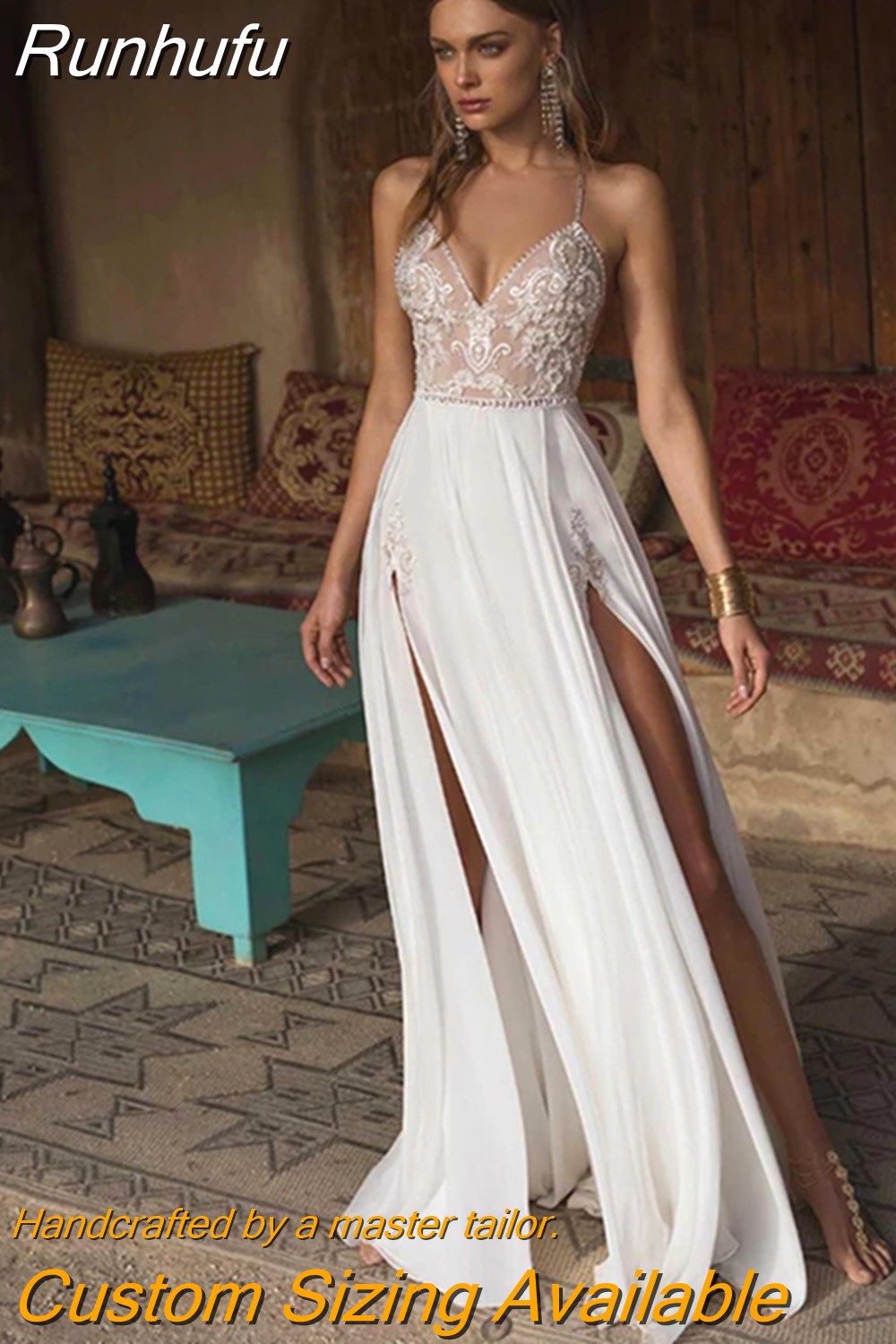 Runhufu Lace Appliqué Sweep Train Wedding Dress For Women Sexy A-Line Split Spaghetti Backless V-Neck Bridal Gown Robe De Mariée