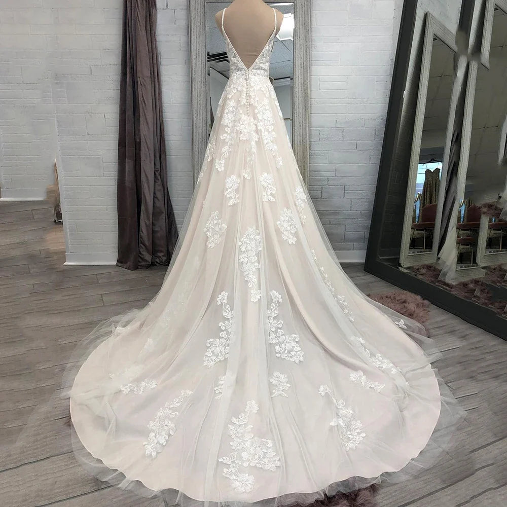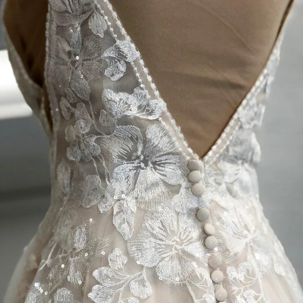 Runhufu Light Champagne A-Line Lace Appliques Wedding Dress V-Neck Sleeveless Beading Bridal Gown Ivory Spagetti Straps Open
