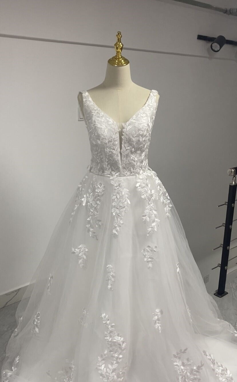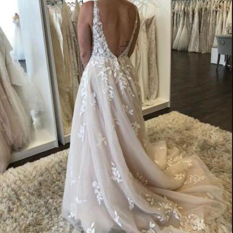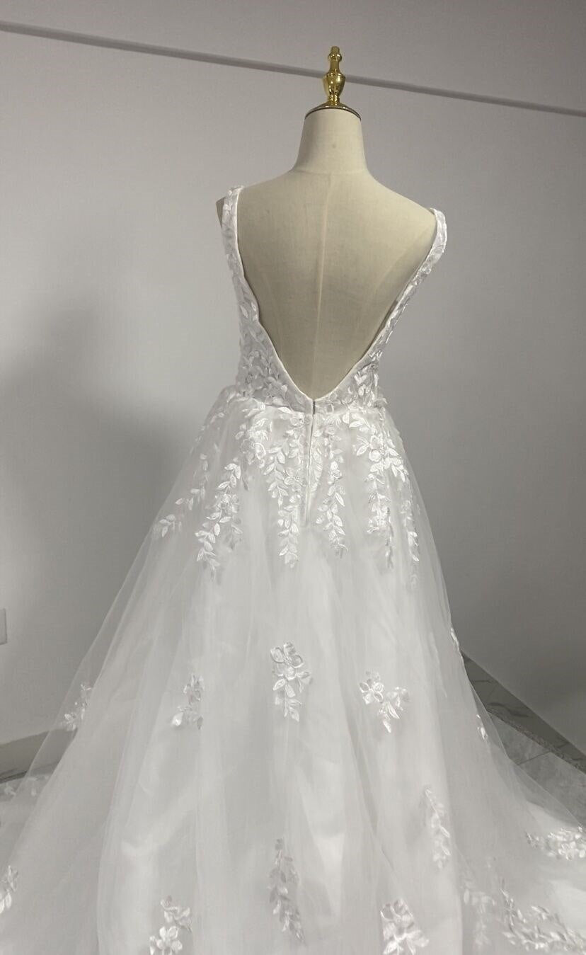 runhufu Line Backless Wedding Dresses V-neck Custom-made Court Train Appliques Sleeveless Robe De Mariée Engagement Plus Size