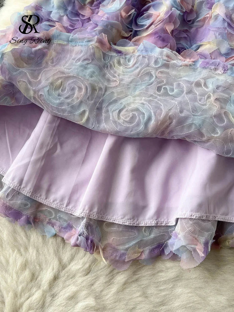 Runhufu Mesh Flower Square Neck Dress Summer Women French Style Zipper Elegant Backless Ladies Purple A Line Midi Dresses