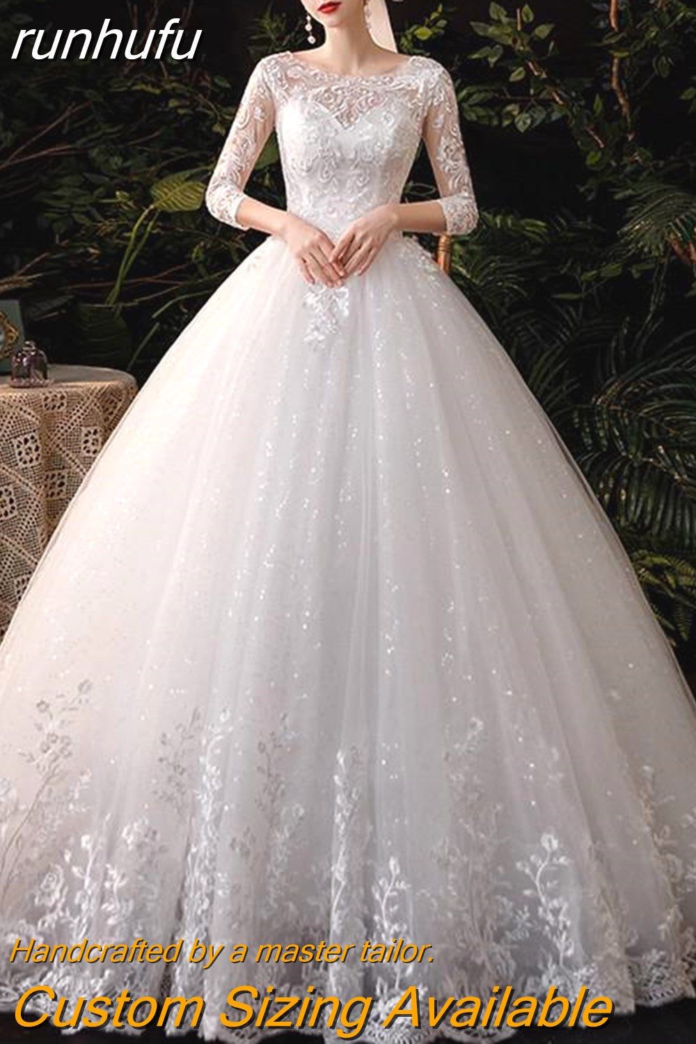 runhufu Neck Wedding Gown With Train 2023 New Three Quarter Sleeve Lace Up Bridal Ball Gown Robe De Mariee Vestido De Noiva