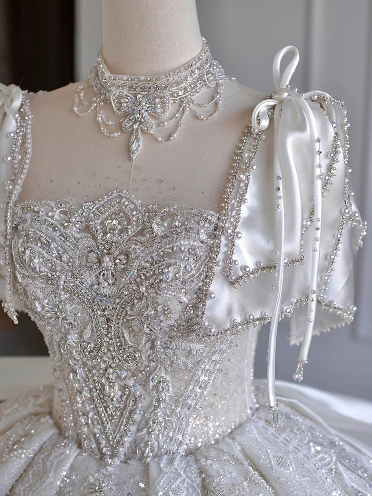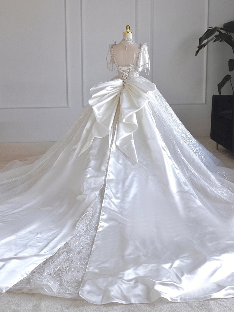 runhufu New Luxury Satin Wedding Dress Boat Neck With Pearl Lace Up Bridal Short Sleeve Glittery Flower Vestido De Noiva Ball Gown