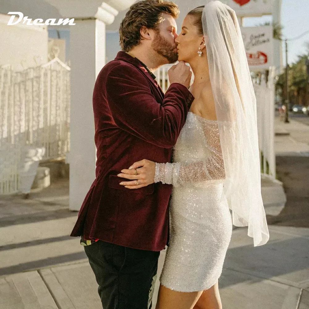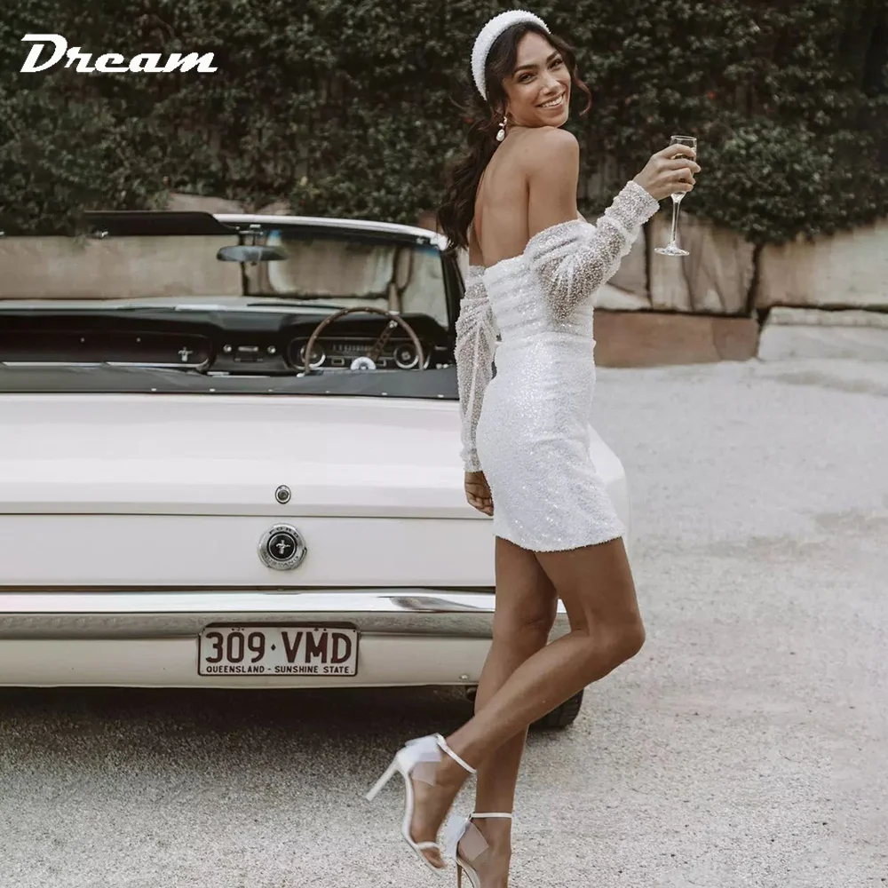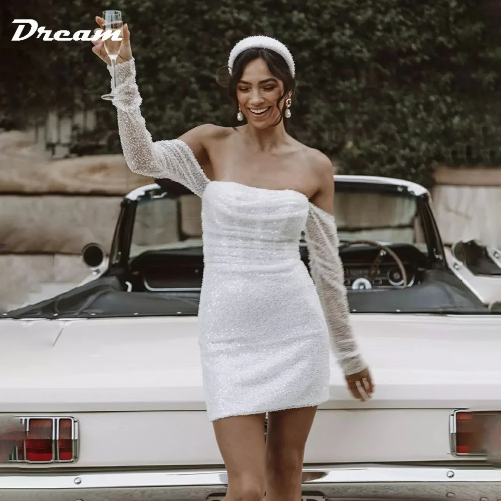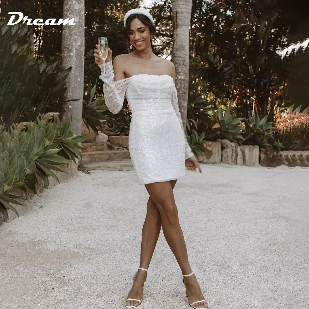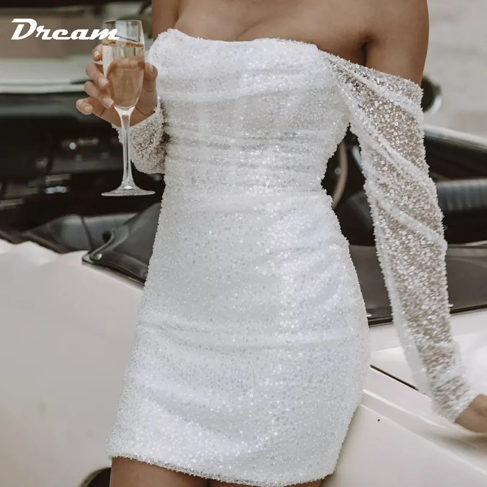 Runhufu Off Shoulder Beading Mini Sheath Short Wedding Dress For Women Shiny Long Sleeves Above Knee Bridal Gown