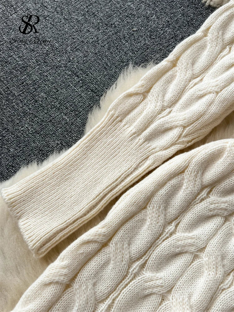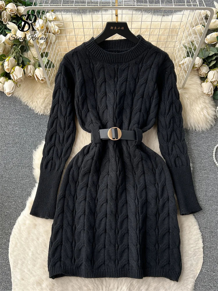 Runhufu Office Lady Knitted Dress Twist Drill Shaped Long Sleeves Belt Solid Women Senior 2024 Winter Thick Sweater Midi Dress