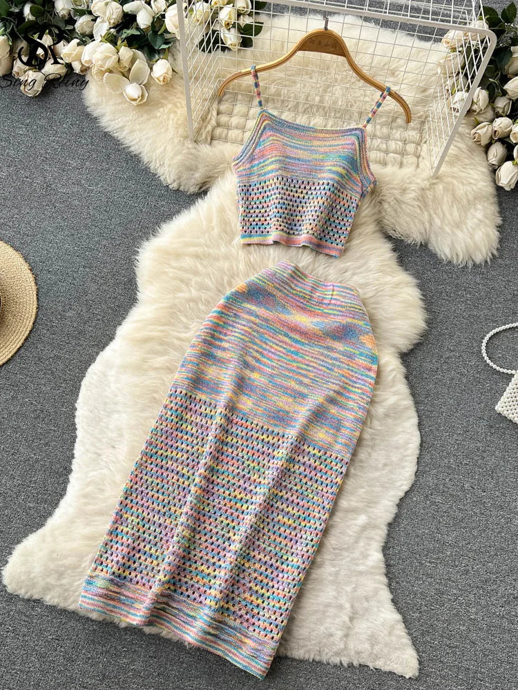 Runhufu Sexy Hollow Out Rainbow Set Knitted Mini Camis Hight Waist Knit Mid Dress Women Streetwear Fashion Two Pieces Suits