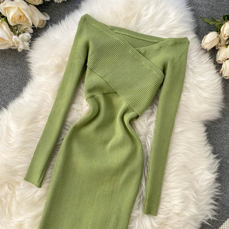 Runhufu Slash Neck Knitted Dress Women Sexy Off Shoulder Cross Elastic Warm Dress Autumn Winter Fashion Sweater Bodycon Dress