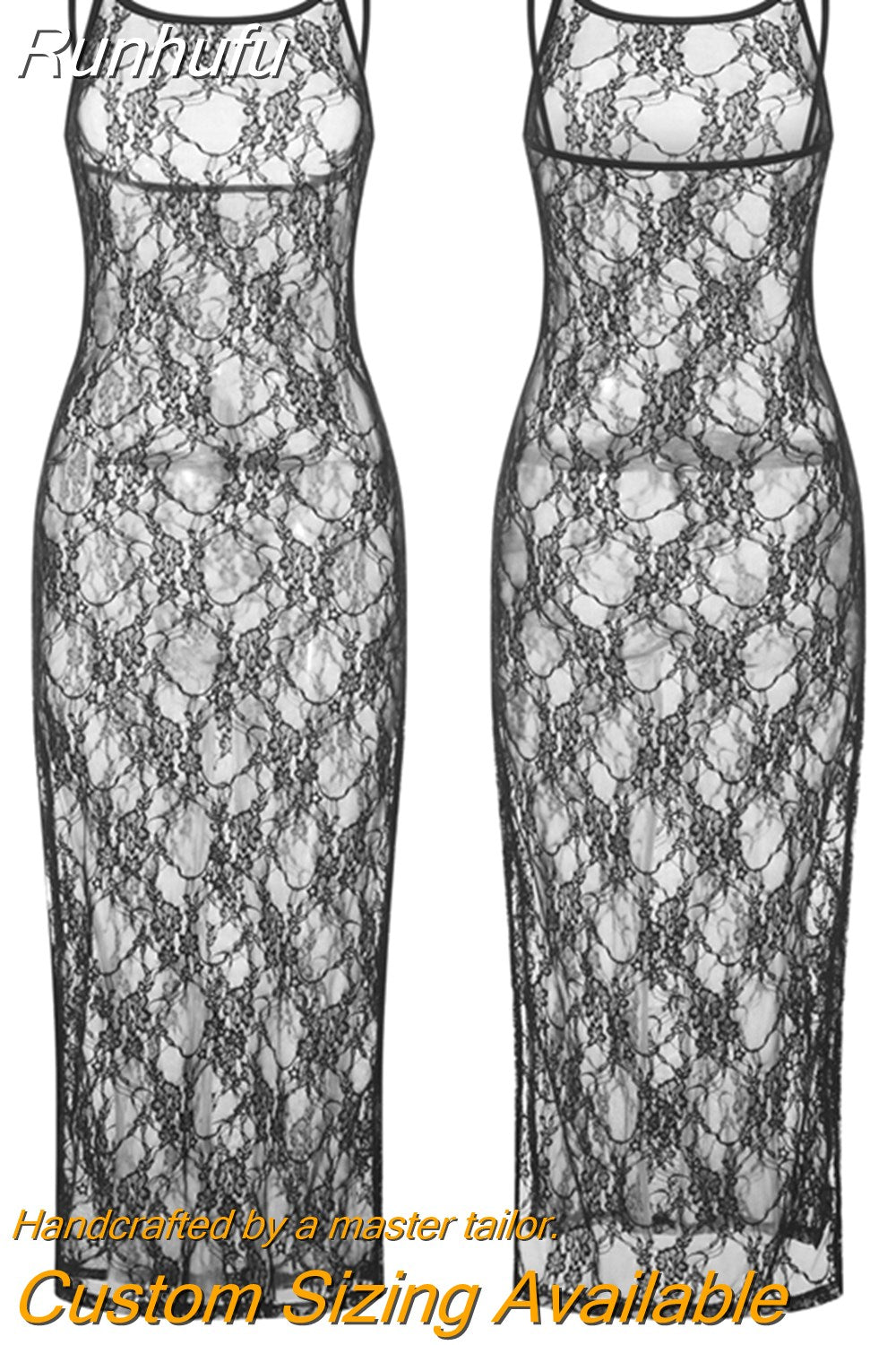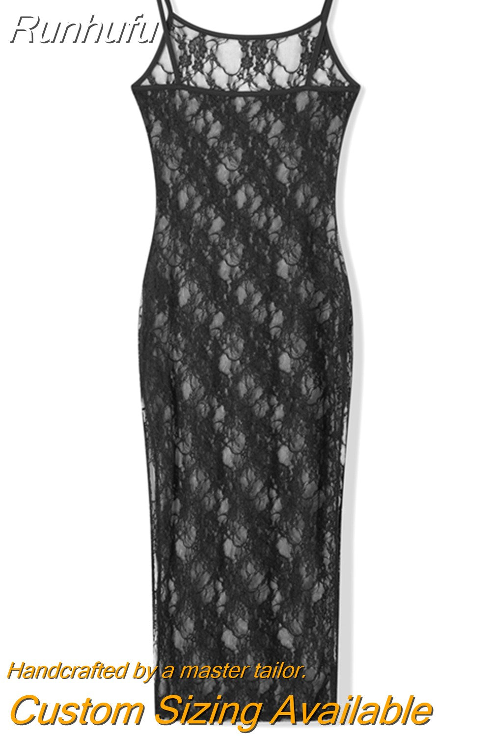 Runhufu Spaghetti Strap See Through Midi Dress Women Black Sexy Sheer Mesh Lace Floral Dresses Chic Y2K Beach Outfits Vestidos