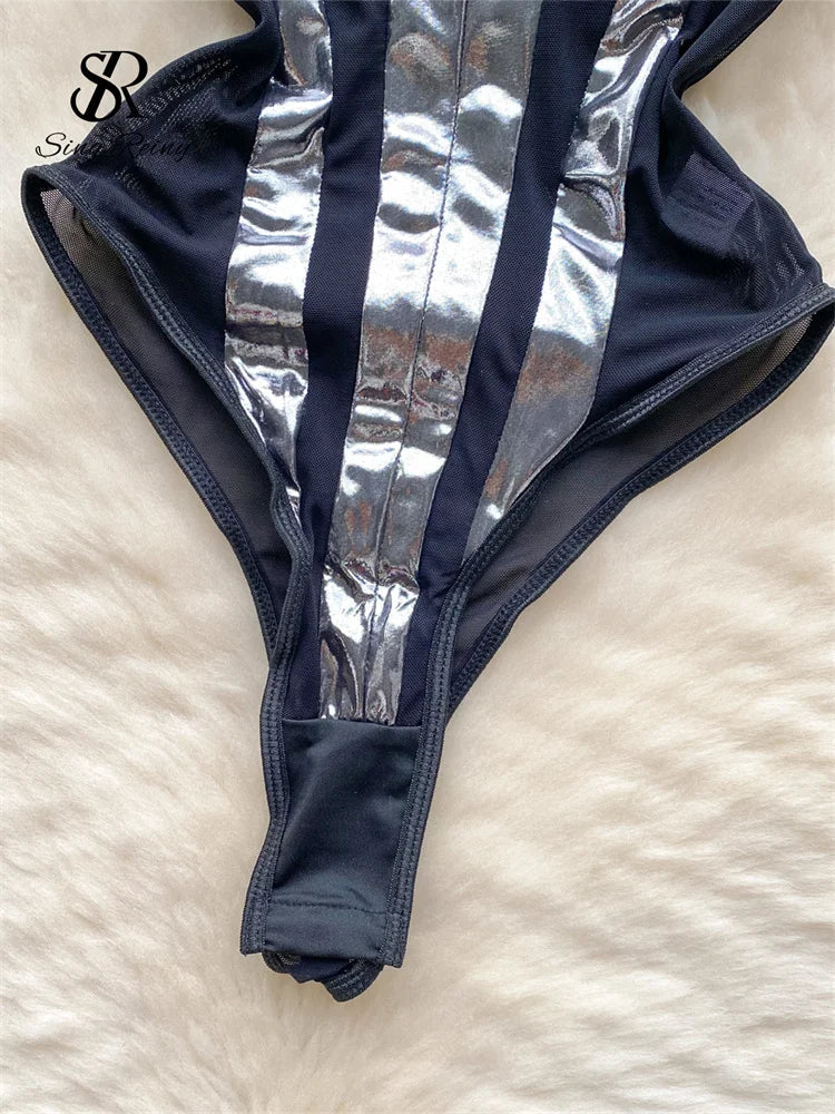 Runhufu Strap Shiny Sexy Bodysuits Ladies 2024 Sleeveless Patchwork Slim Lingerie Top Open Crotch Mesh Erotic Playsuits