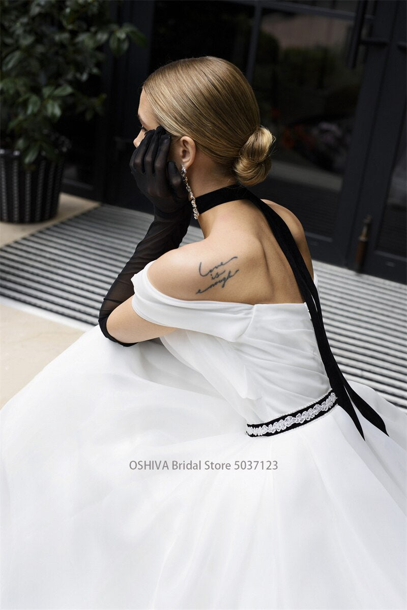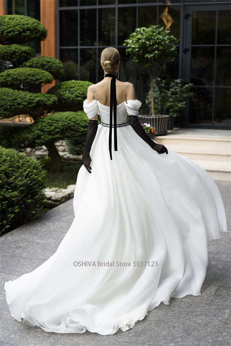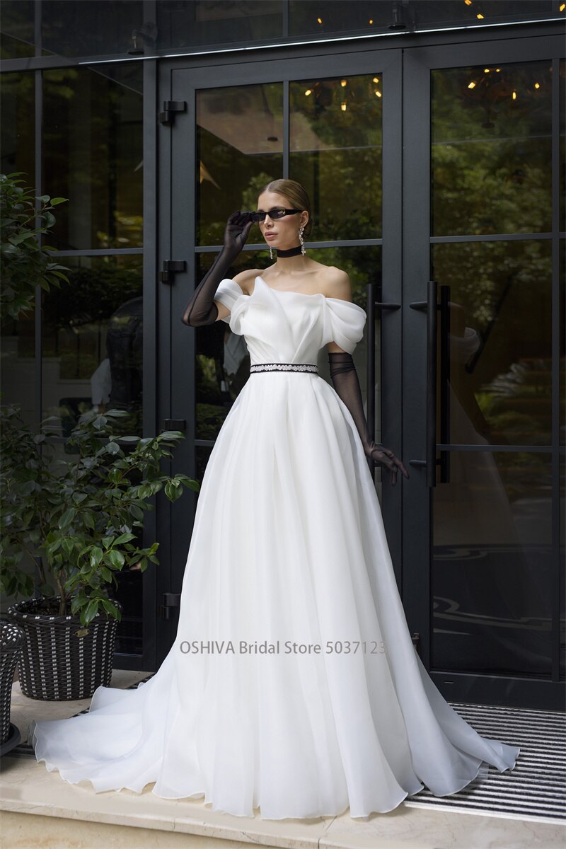 Runhufu Strapless A-Line Satin Wedding Dresses Off the Shoulder Short Sleeves Sweep Train Bridal Gowns Vestido De Novia