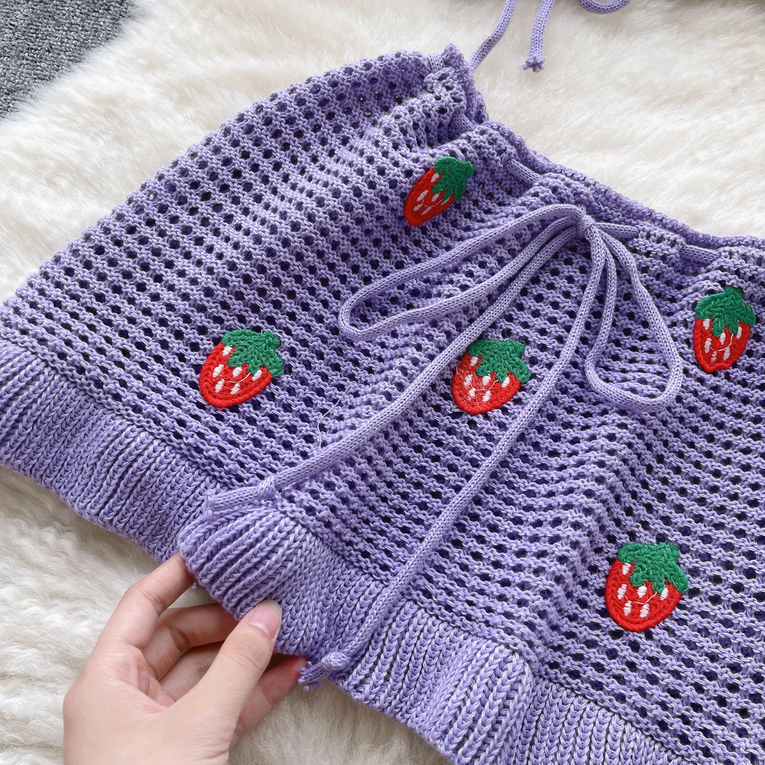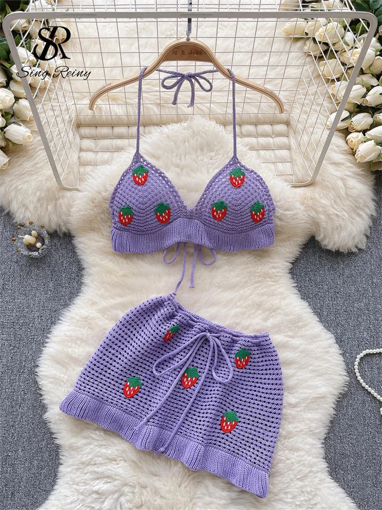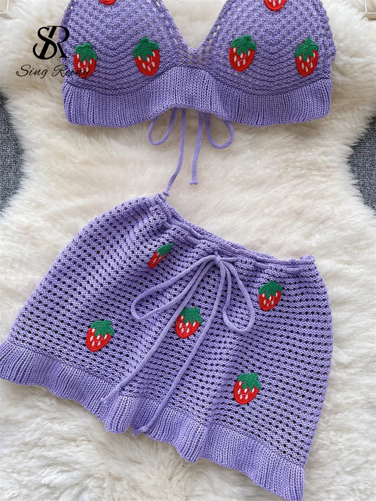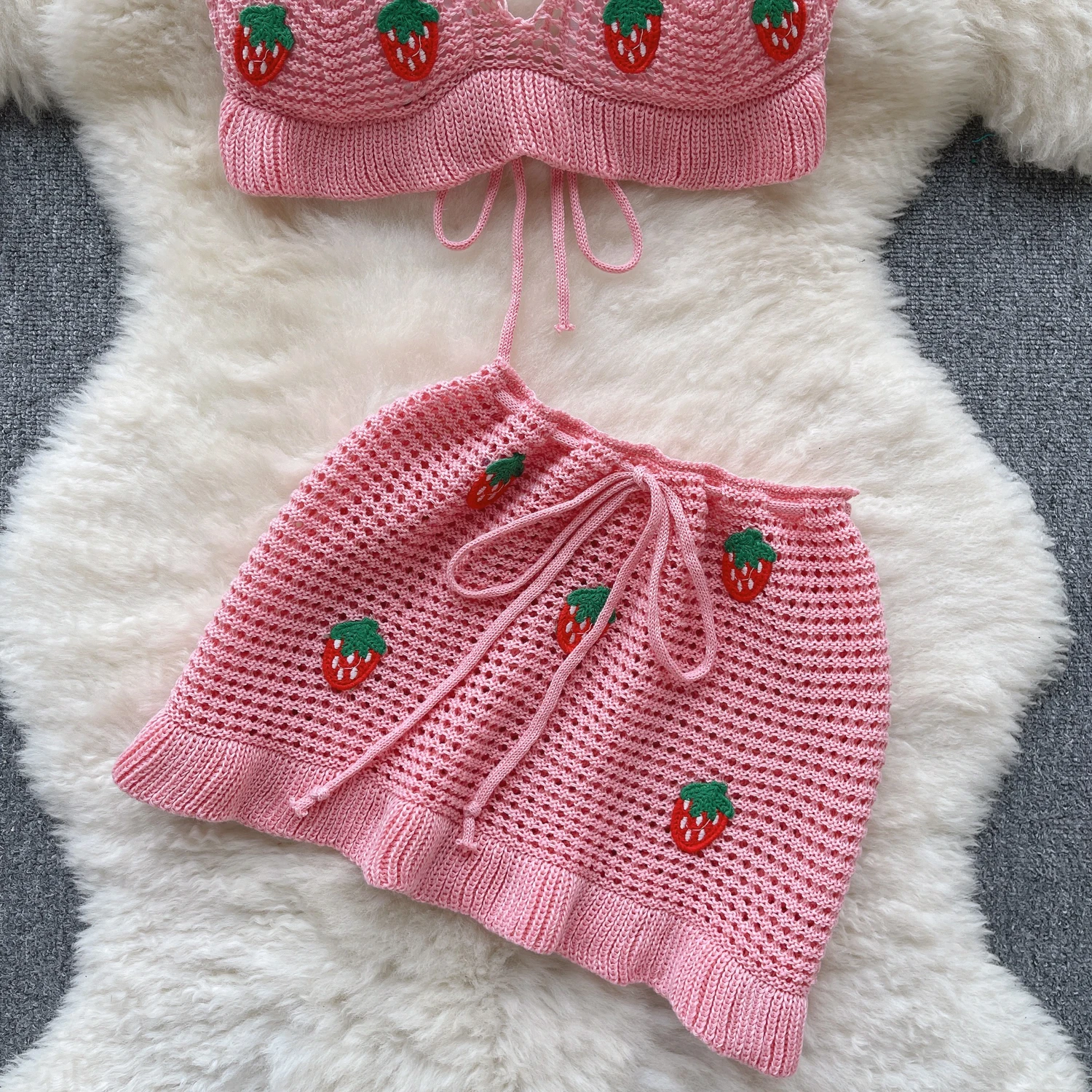 Runhufu Strawberry Sweet Beach Two Pieces Sets Halter Backless Camis+Short Skirts Fashion Hook Flower Hollow Out Beach Suits