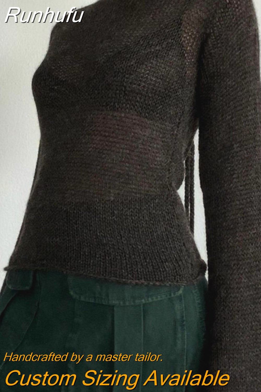 Runhufu Tie Back Sweaters Women Long Sleeve Boat Neck Solid Color Knitted Pullover Casual Crochet Tops 2023 Fall New