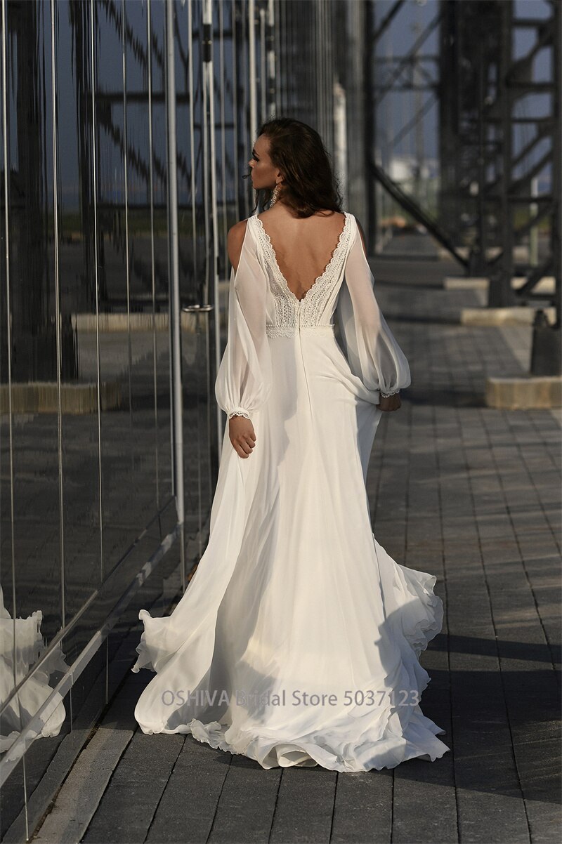Runhufu V-Neck Beach Wedding Dress Lace Appliqued Hight Split Long Sleeves Satin Chiffon Bridal Gown Robe De Mariee