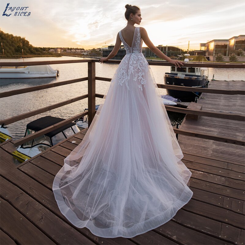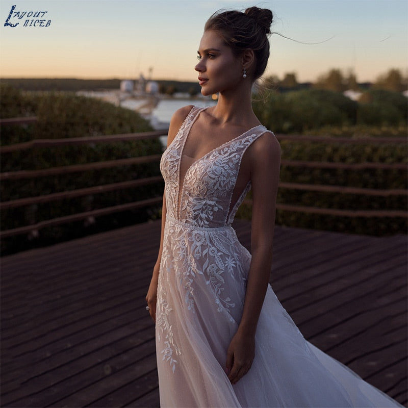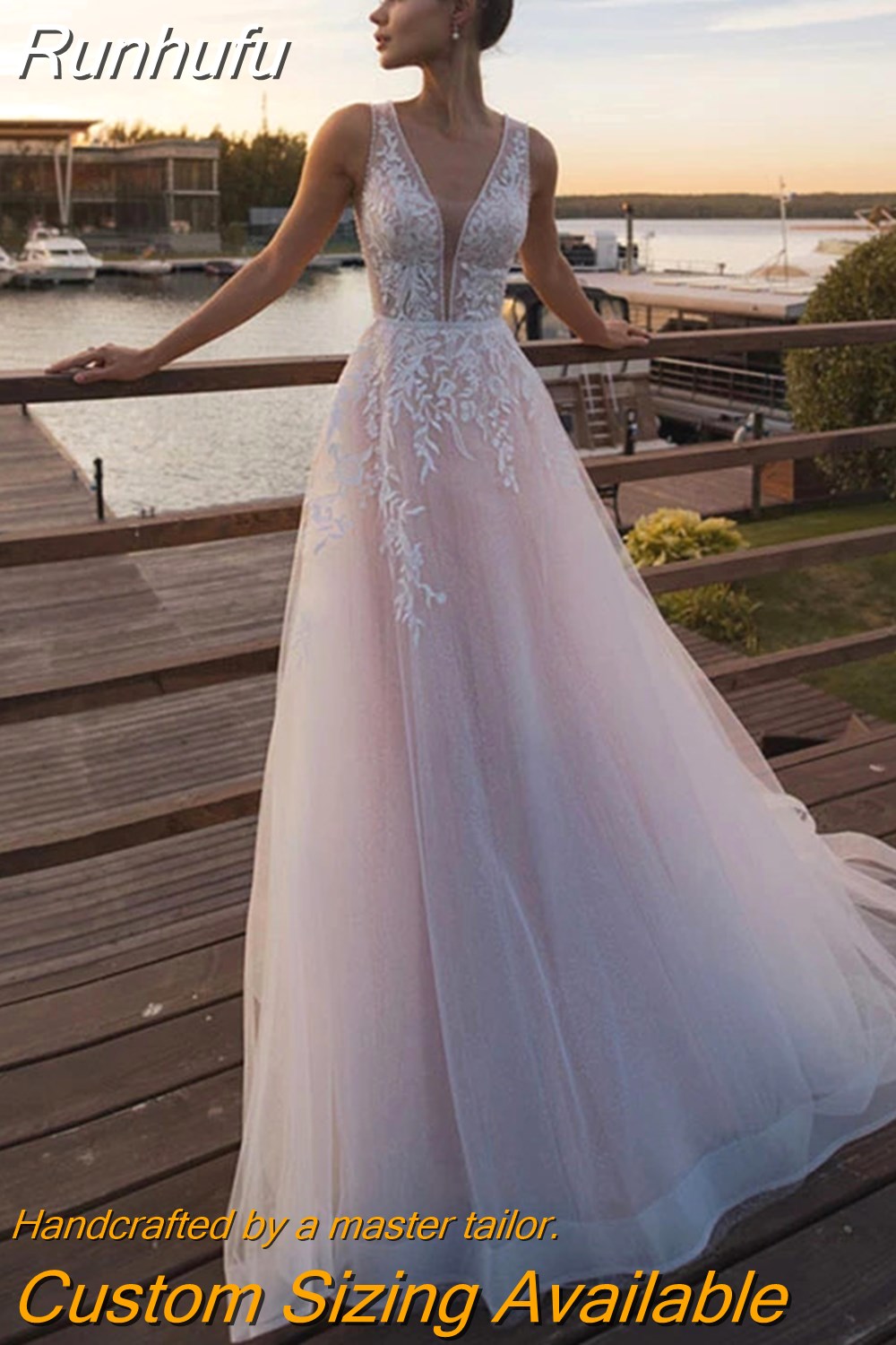 Runhufu V-Neck Wedding Dress Lace Appliques Sleeveless Tulle Sweep Train Robe De Mariée Bohème Back Buttons Bridal Gown Bride
