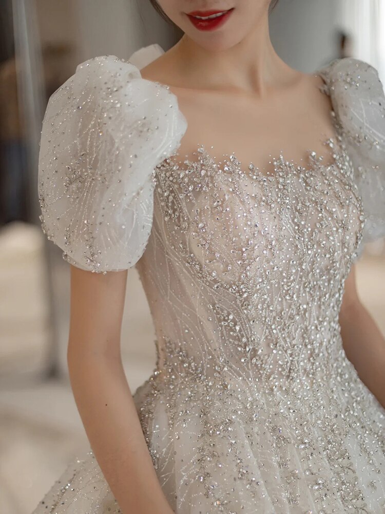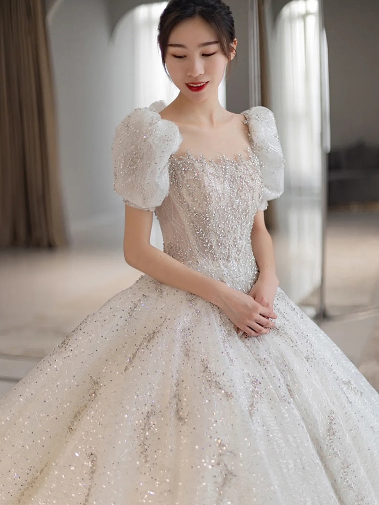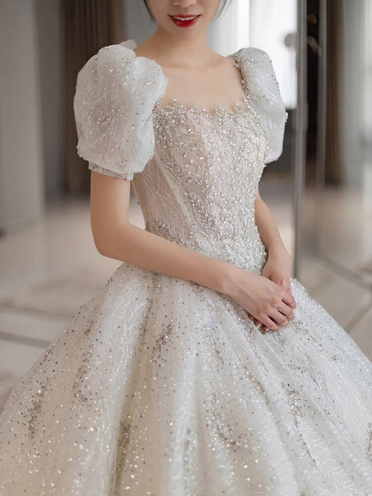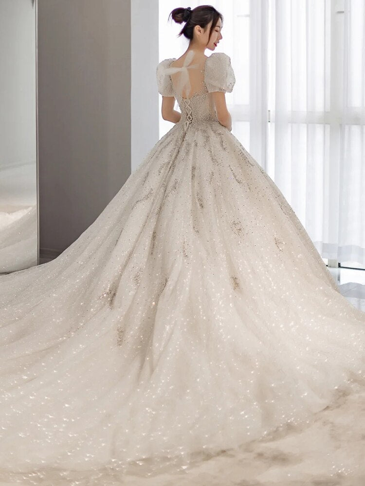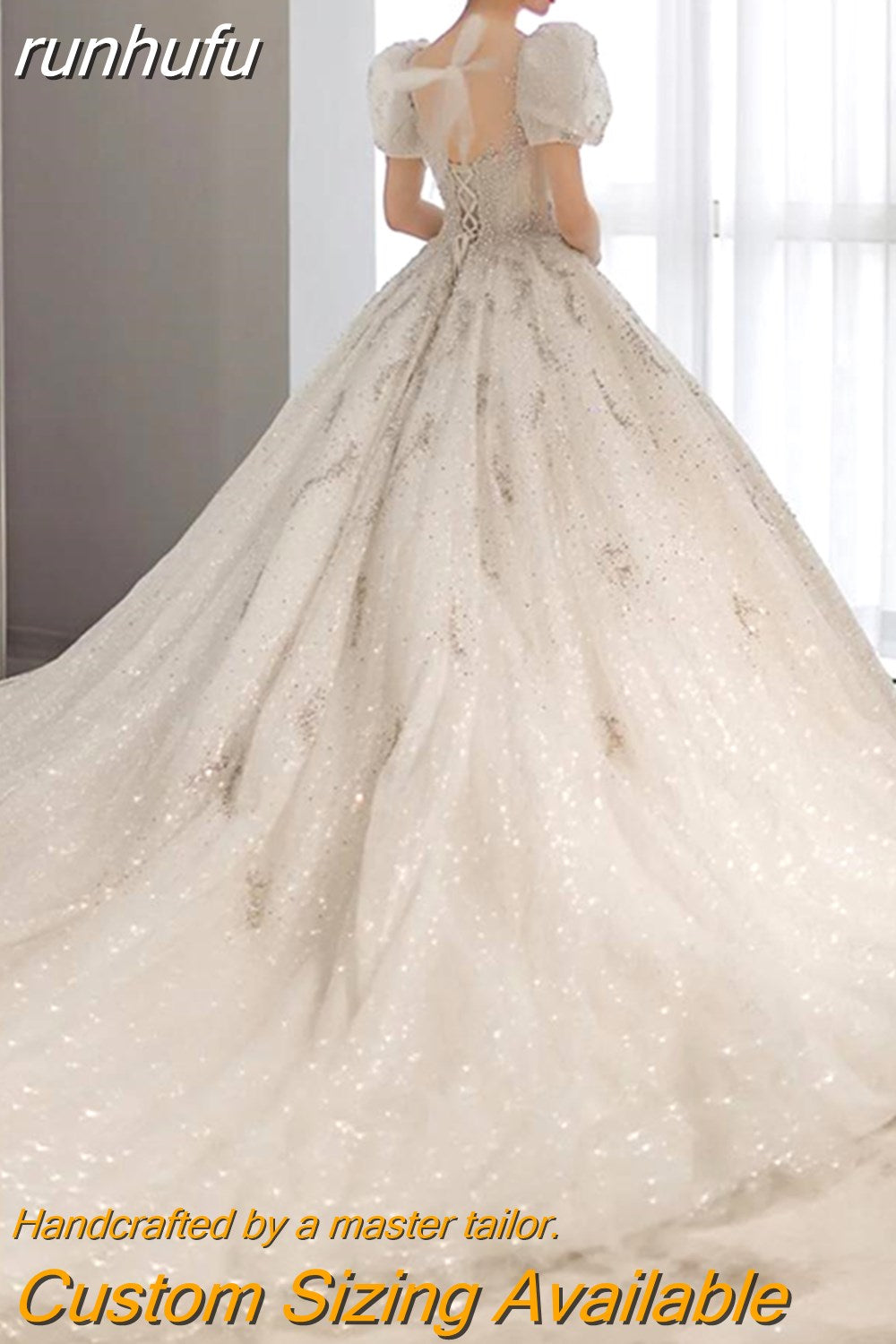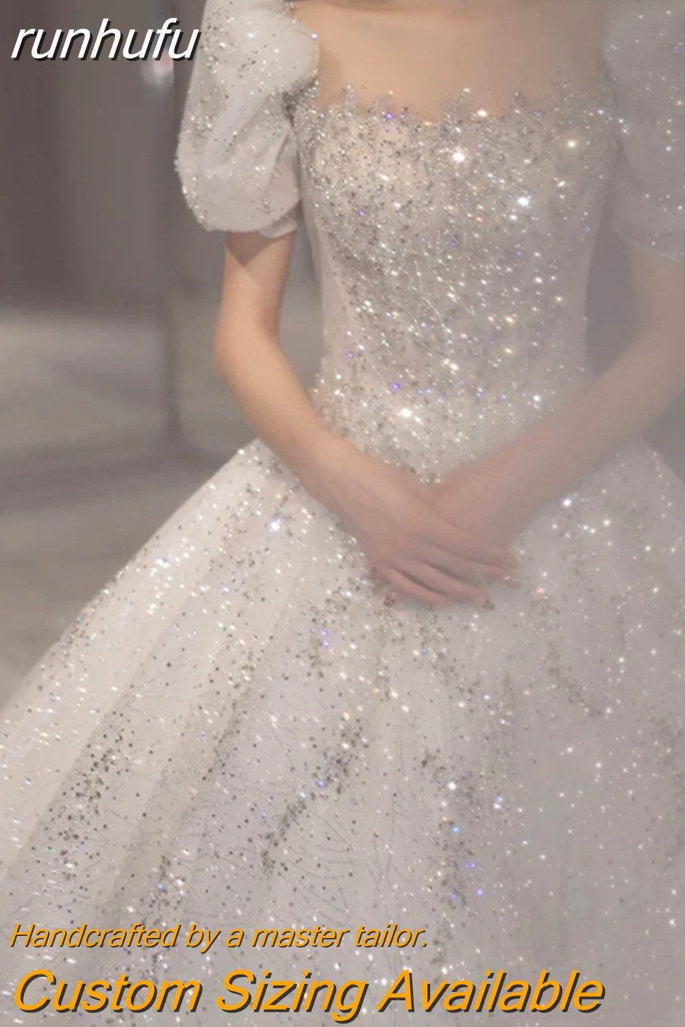 runhufu Wedding Dress 2023 Star Sky Long Train High Waist For Pregnant Crystal Shinny Bride Dress Short Sleeve Ball Gown Dresses