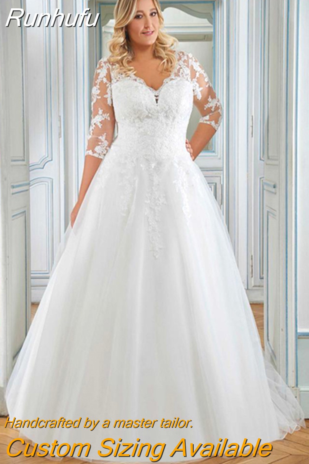 Runhufu Wedding Dress Plus Size 3/4 Sleeves V Neck Tulle Lace Applique Vestido De Noiva Bride Dresses Big Size Women Modest 2023