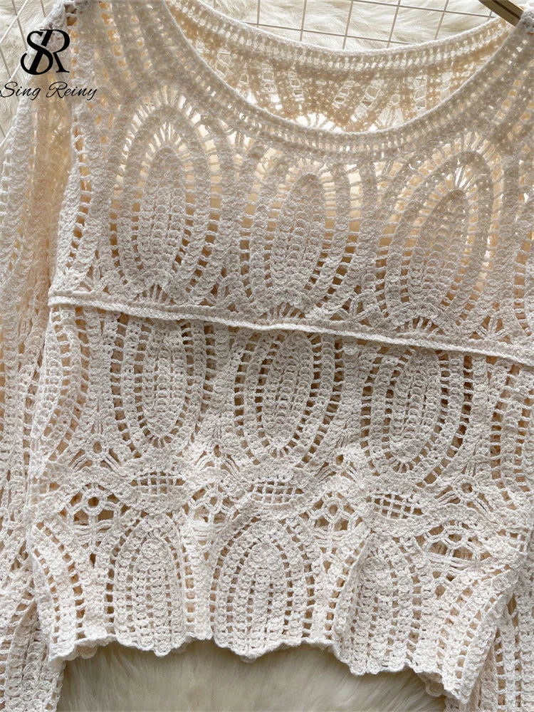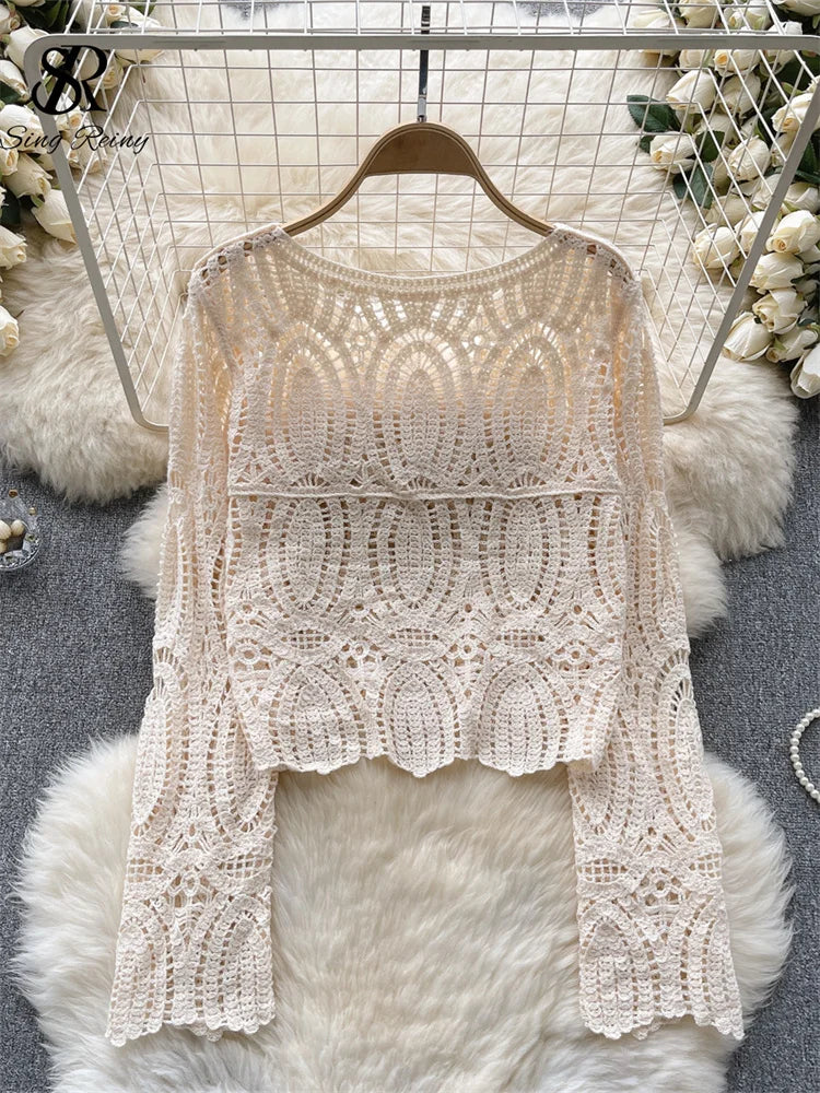 Runhufu Women France Hollow out Tops 2024 Fashion O Neck Gentle Knit T Shirt Long Sleeve Lady Office Hotsweet Autumn Blouse