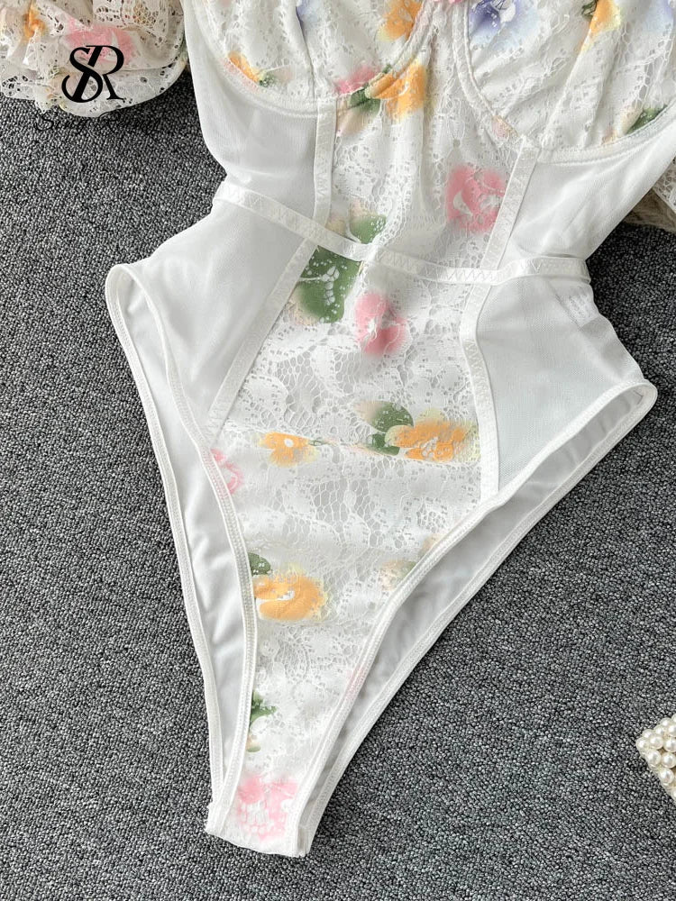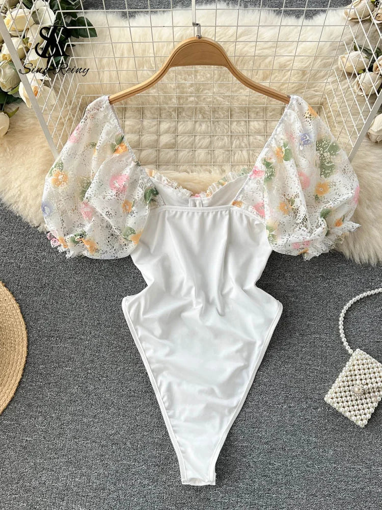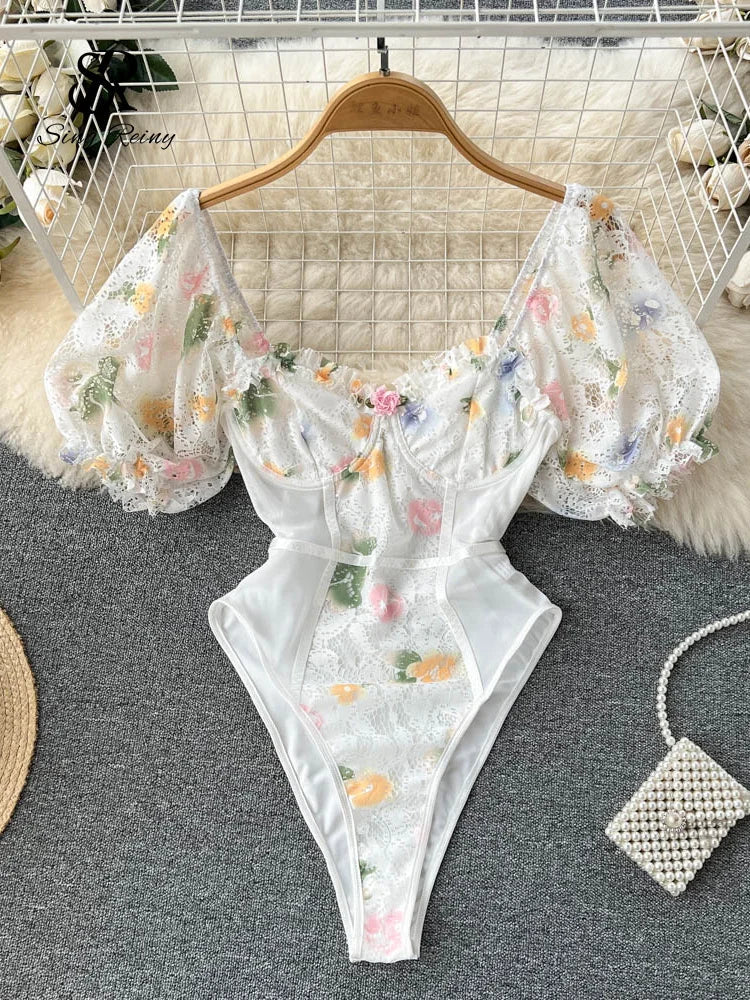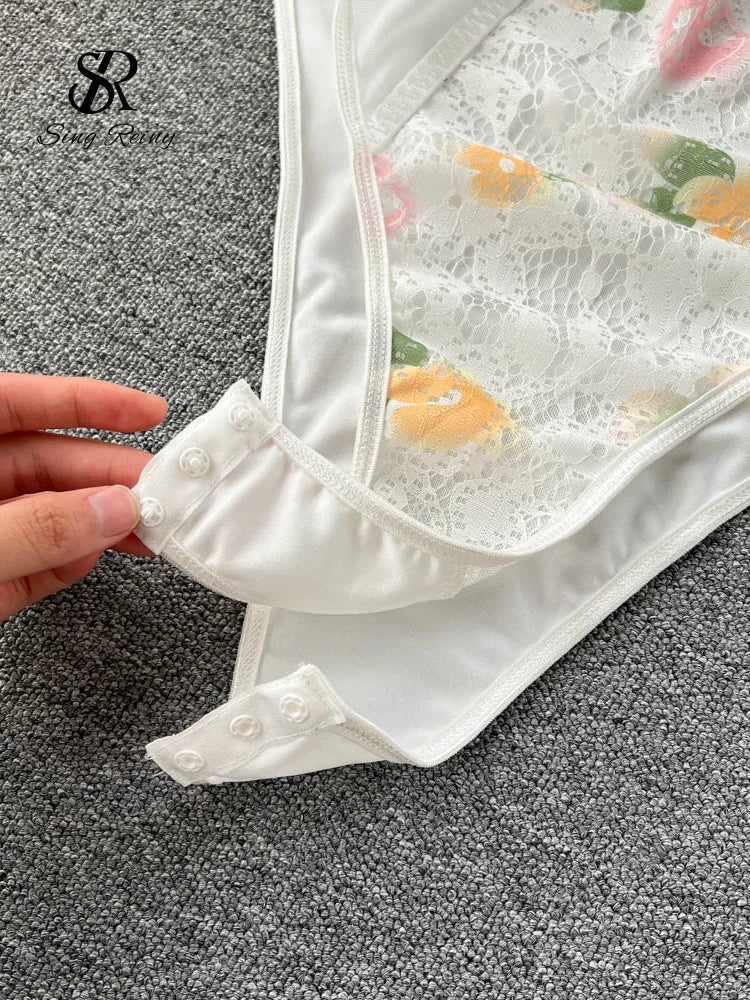 Runhufu Women Lace Floral Print Bodysuits Short Sleeves Transparent Inside wear Rompers Ladies Backless Beach Sexy Palysuits