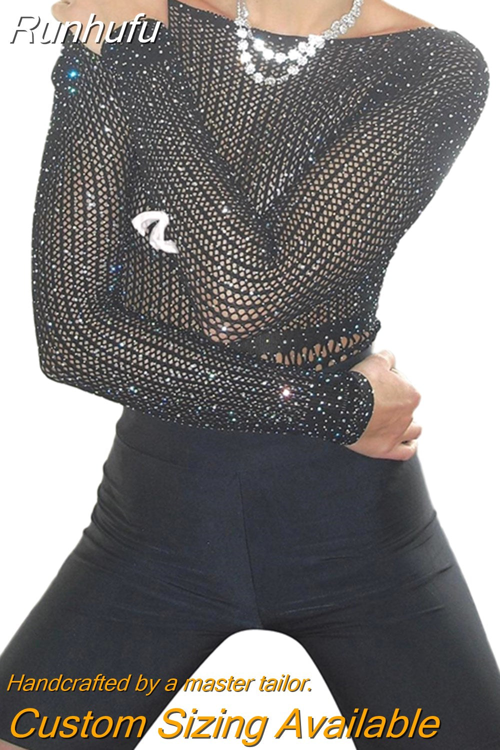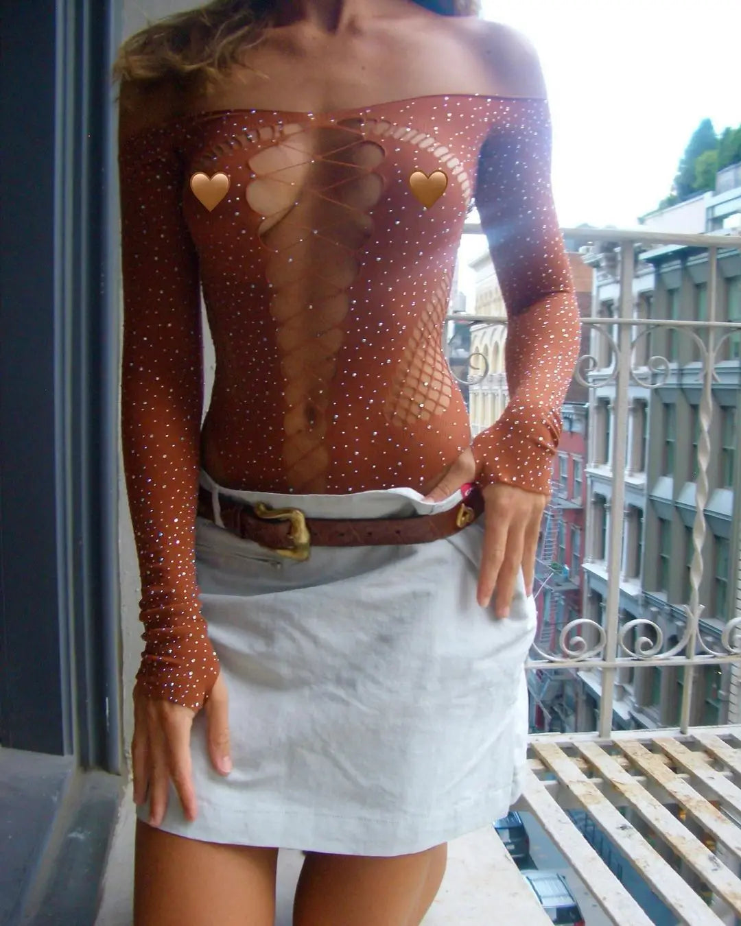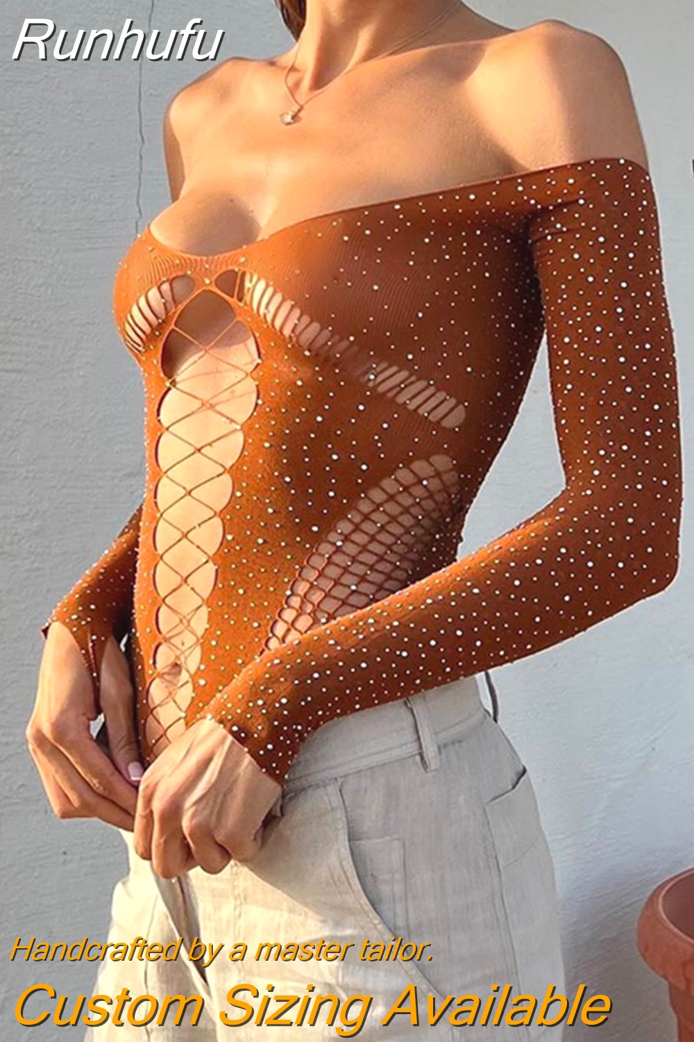 Runhufu Women’s Off Shoulder Bodysuit Shiny Rhinestone Long Sleeve Hollow Out Slim Fit Leotard Tops