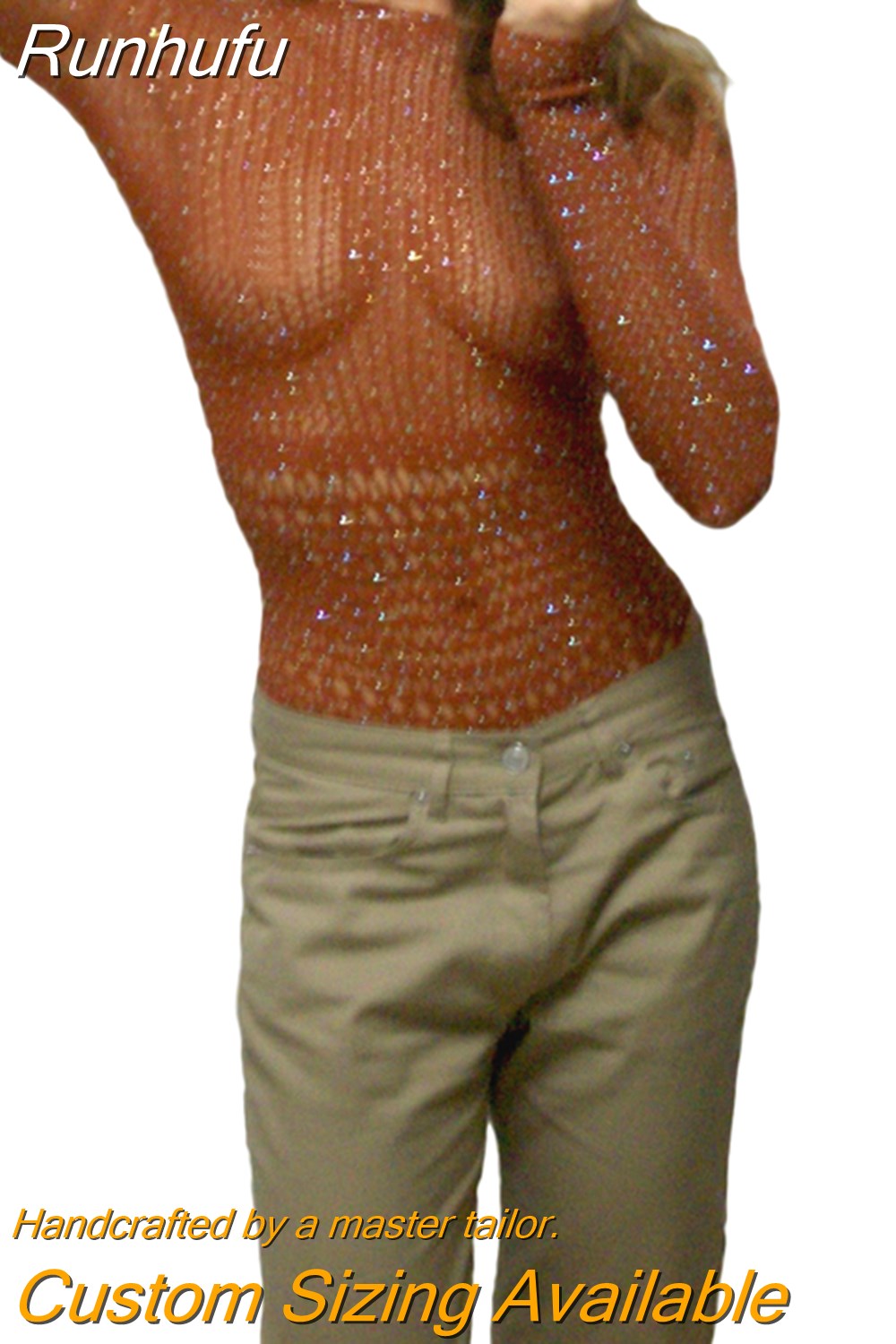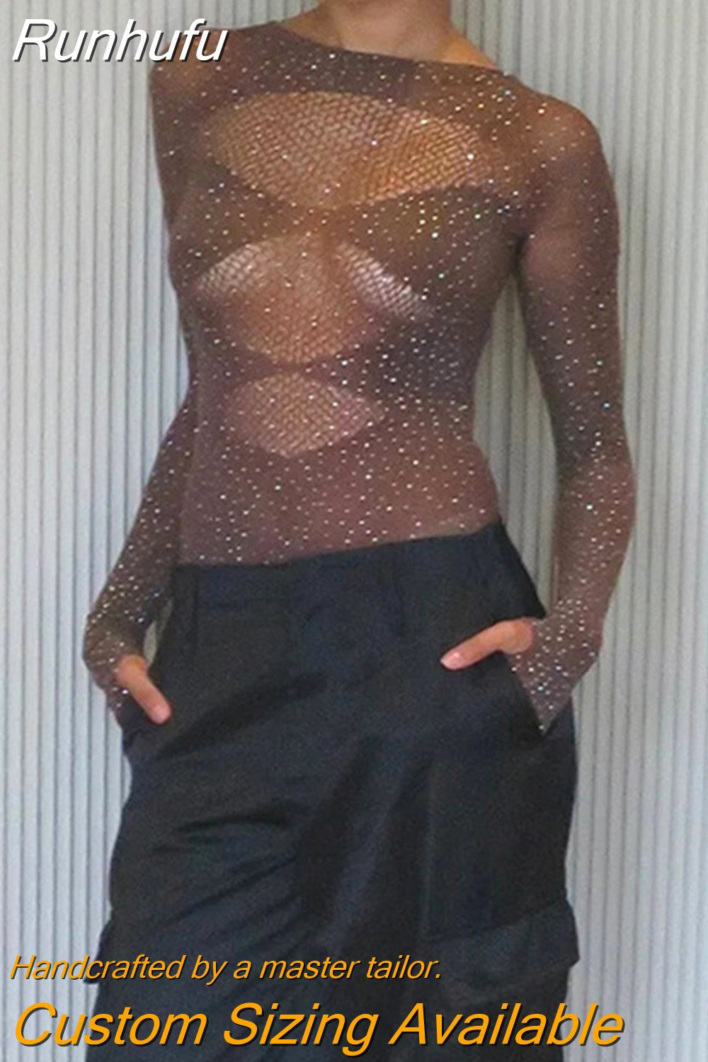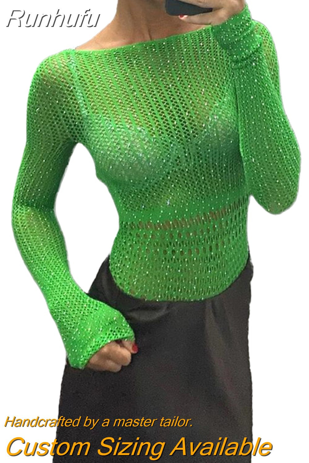 Runhufu Women’s Off Shoulder Bodysuit Shiny Rhinestone Long Sleeve Hollow Out Slim Fit Leotard Tops