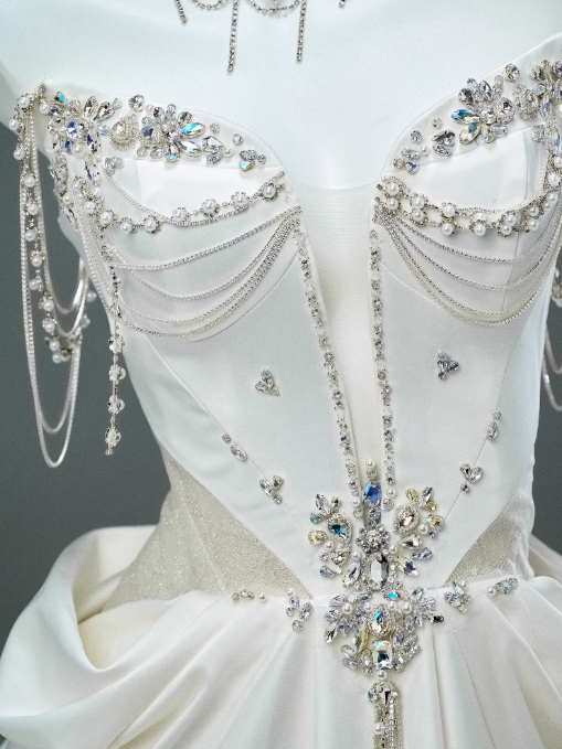 White Satin A-line Sweetheart Beaded Long Prom Dress, Elegant Adult Ceremony Graduation Prom Dress HZ1108