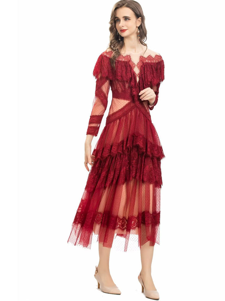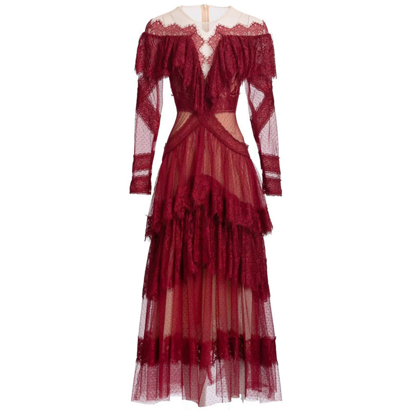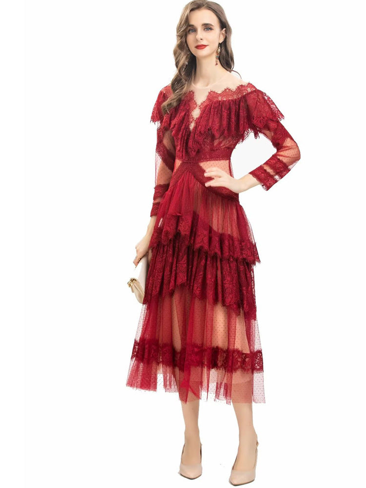 runhufu Round Collar Lotus Side Spliced Long Sleeve Elegant Lace Wine Red Dress Women's Autumn New 2025