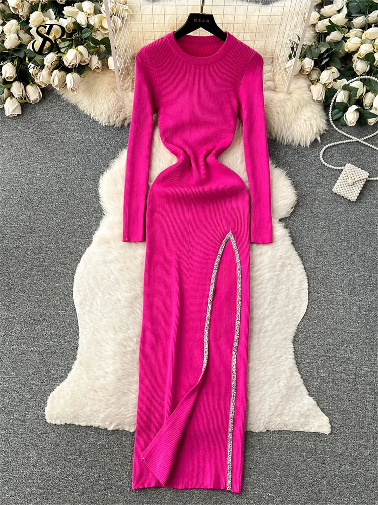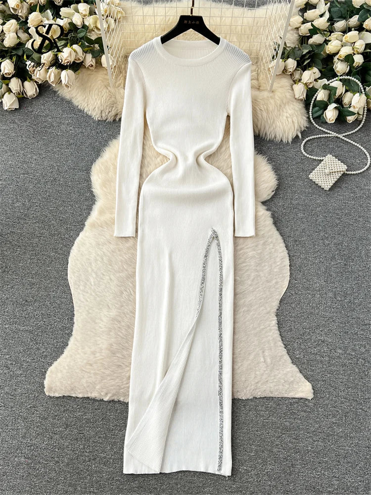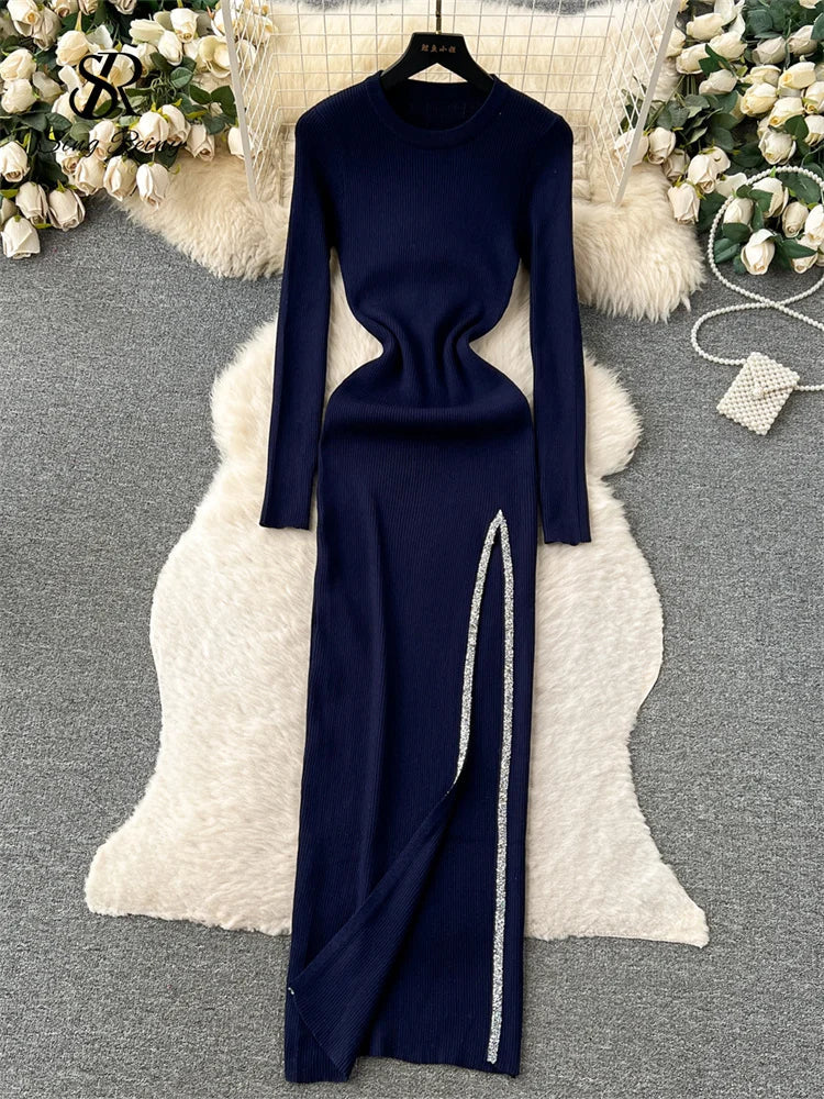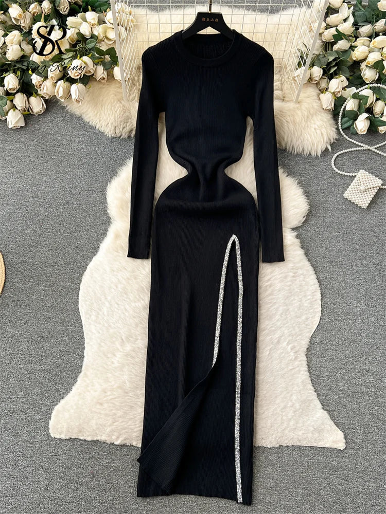 Runhufu Streetwear Knit Split Dress O Neck Long Sleeves Slim Fit France Elegent Ladies Autumn Evening Party Bodycon Long Dress