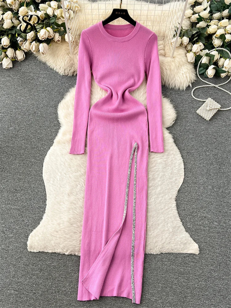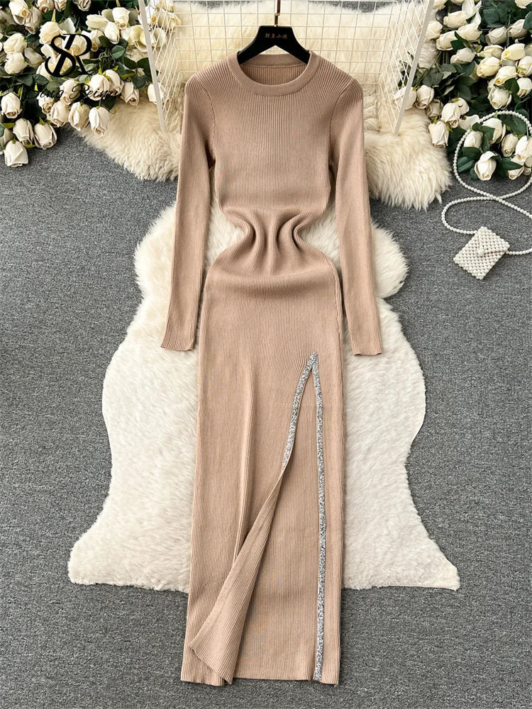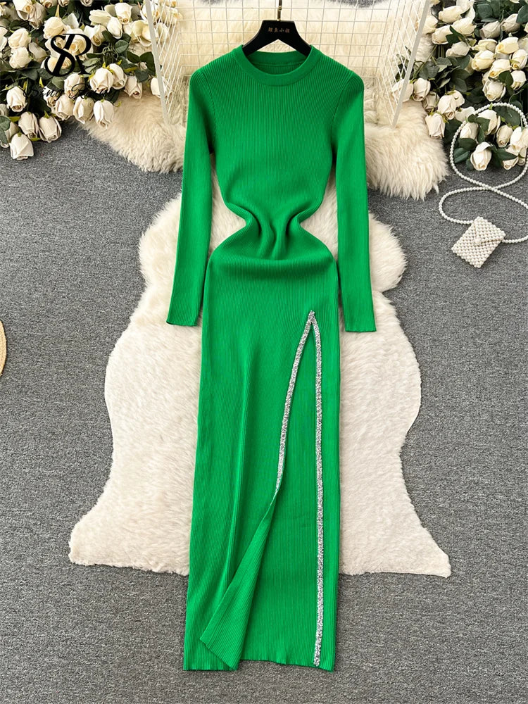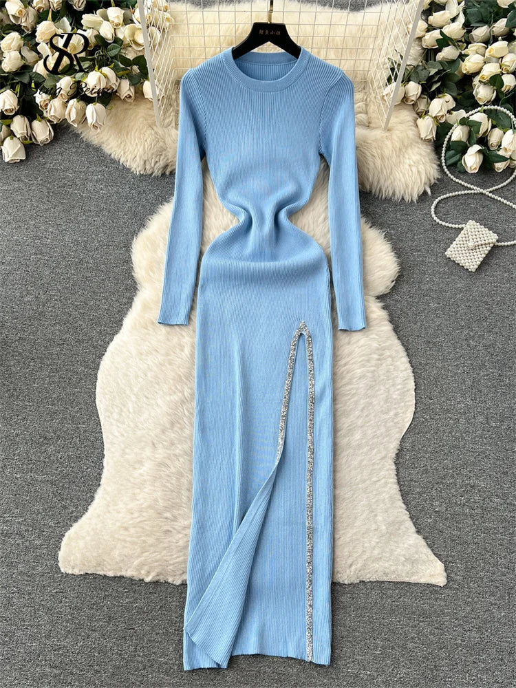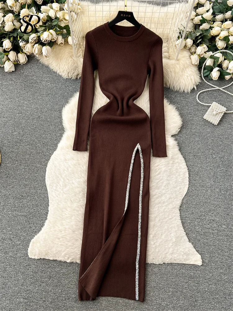 Runhufu Streetwear Knit Split Dress O Neck Long Sleeves Slim Fit France Elegent Ladies Autumn Evening Party Bodycon Long Dress
