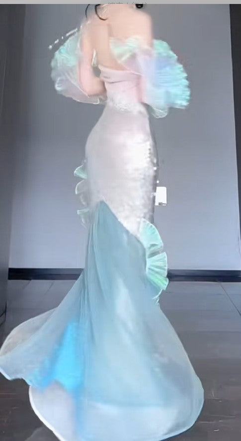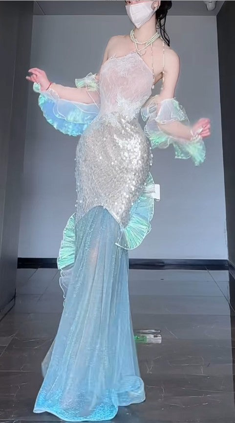 Gorgeous Ice Blue Mermaid Tulle Mask Prom Dresses Sparkling Sequin Evening Gowns HZ1108