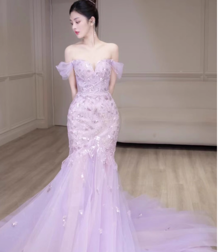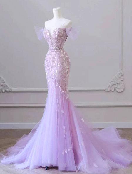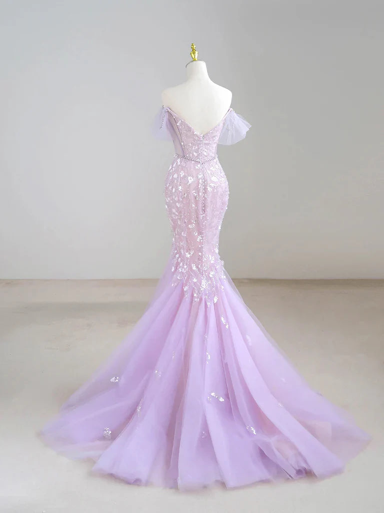 Mermaid Off-Shoulder Tulle Sequin Long Prom Dress Purple Formal Dress HZ1108