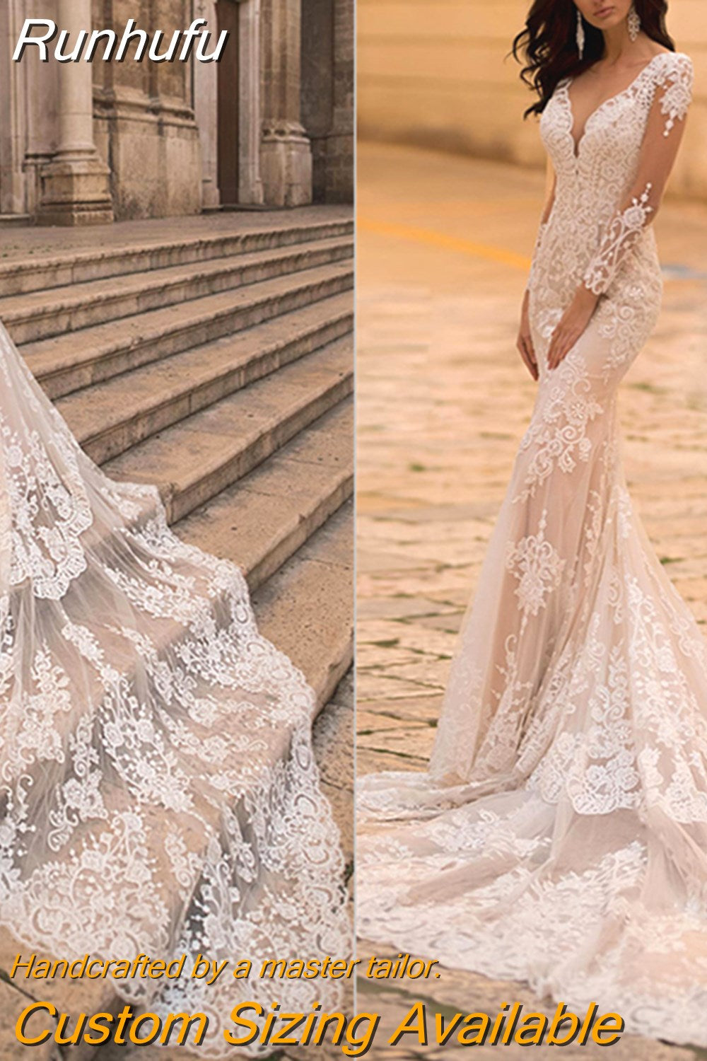 Runhufu Long Sleeves Lace Mermaid Wedding Dress For Bride Satin Bridal Gowns Elegant Plus Size Custom Made Vestido De Novia 2023