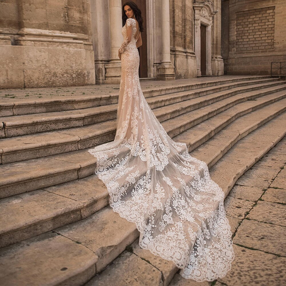 Runhufu Appliques Cathedral Train Mermaid Wedding Dresses 2023 V-Neck Button Back Tulle Bridal Gown Gorgeous Свадебное Nлатье