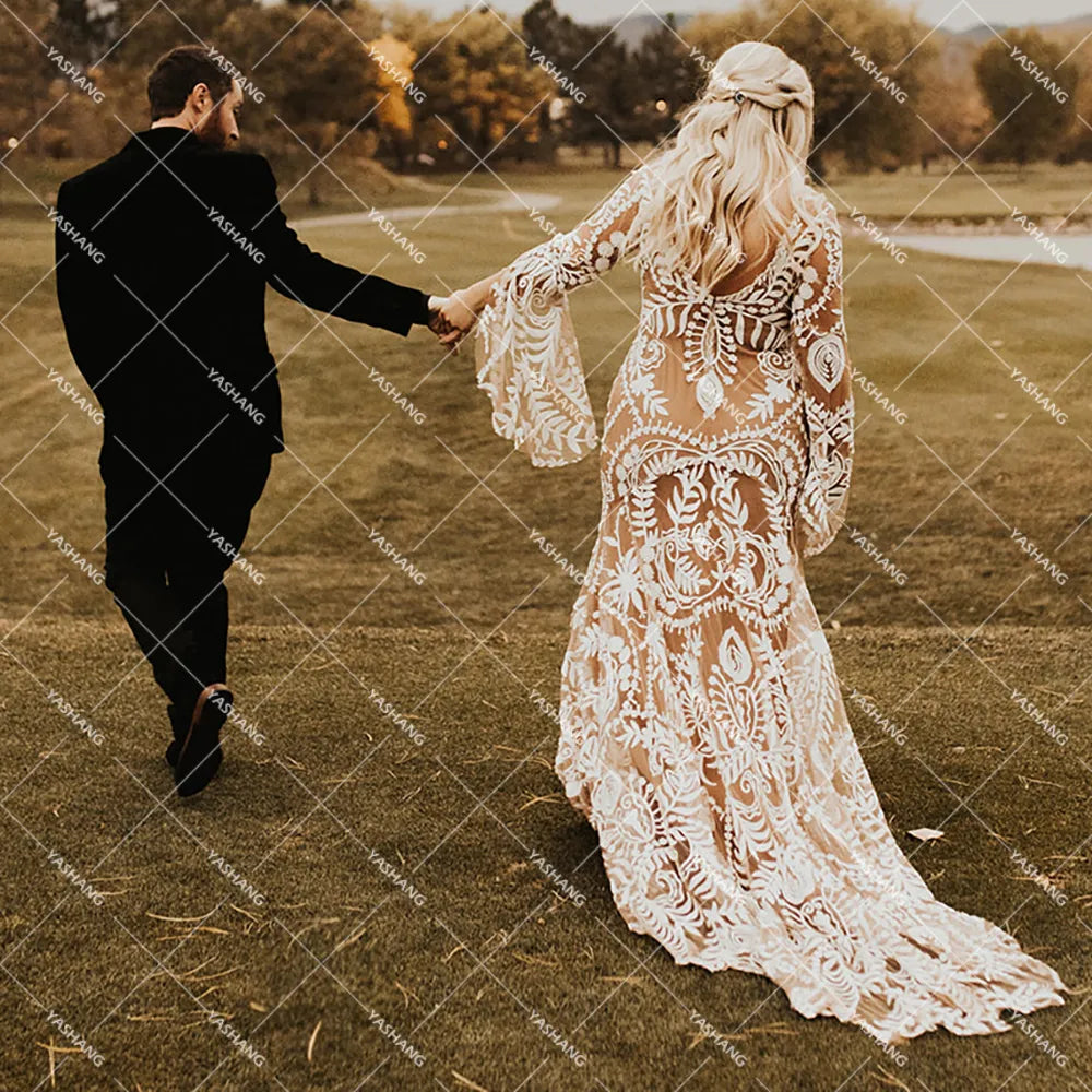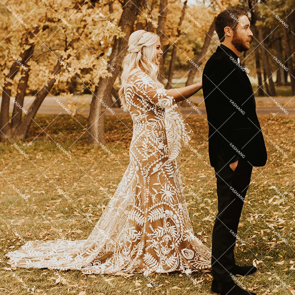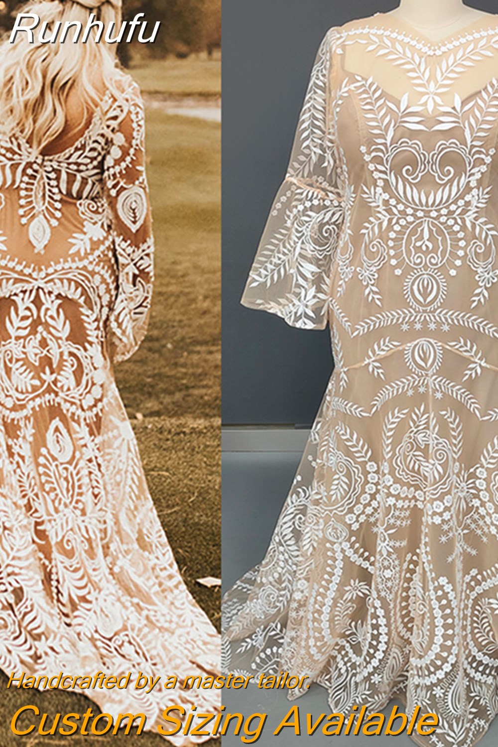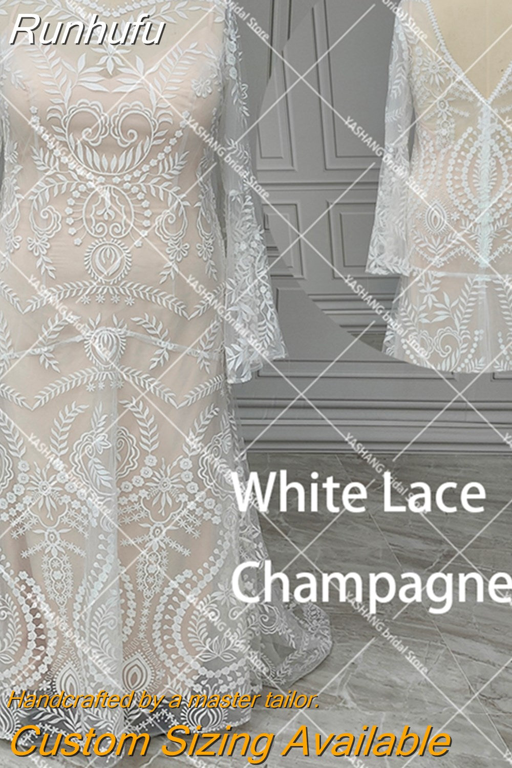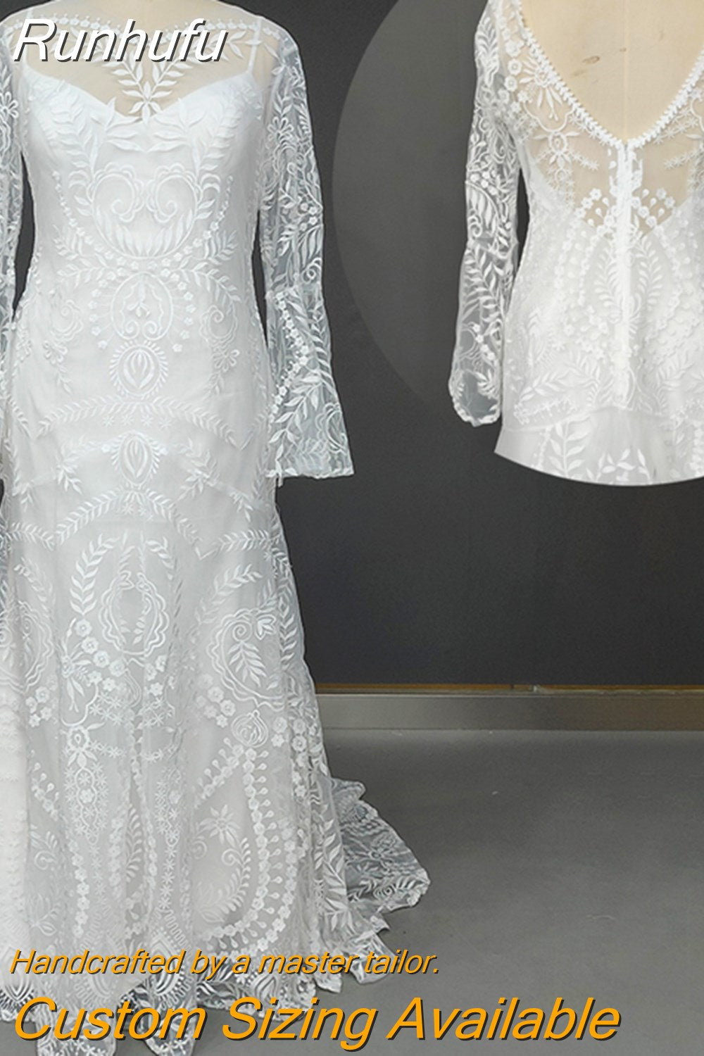 Runhufu Batwing Sleeves Lace Two Pieces Wedding Gowns Drop Ship Plus Size Custom Made Mermaid Rustic Open Back Boho Bridal Dress