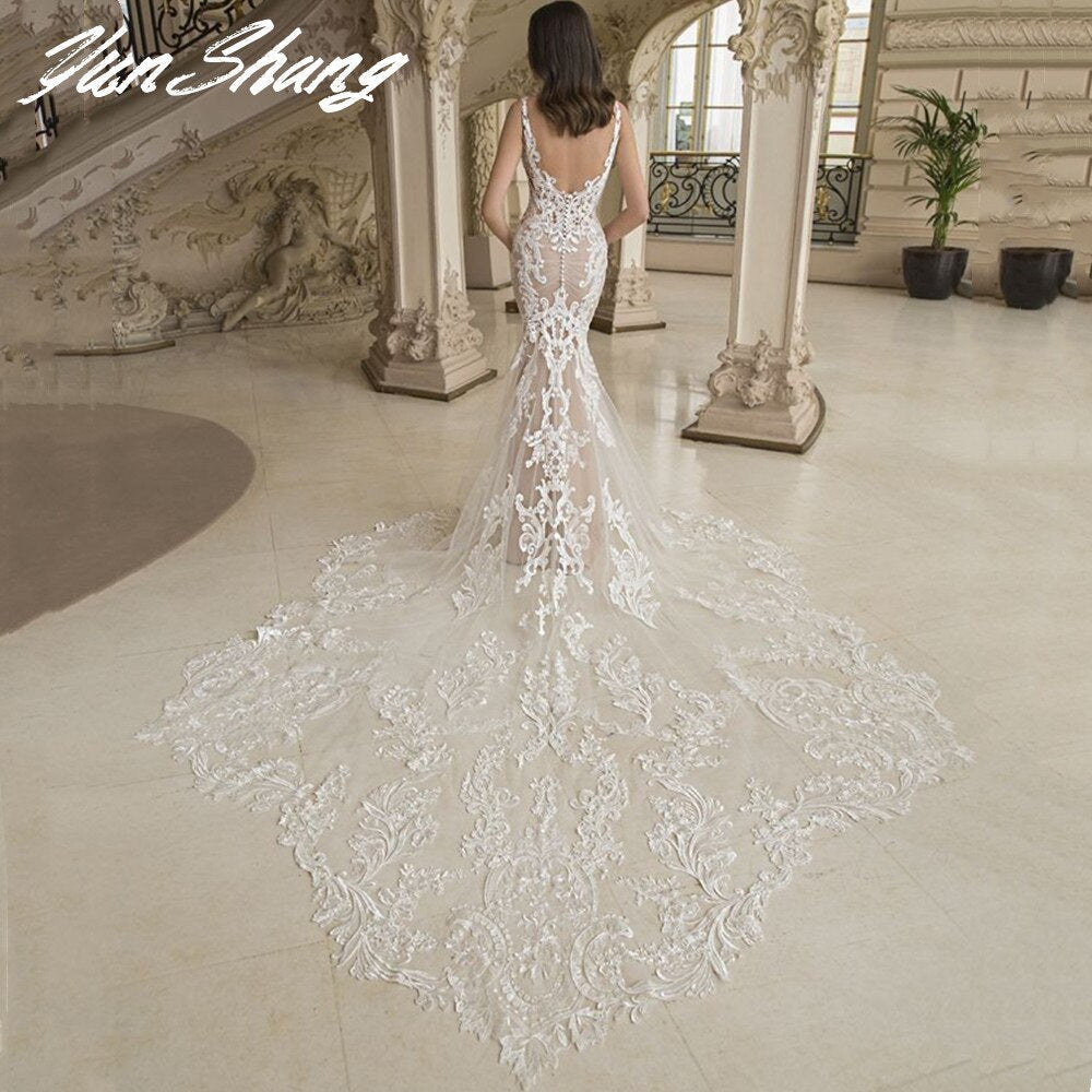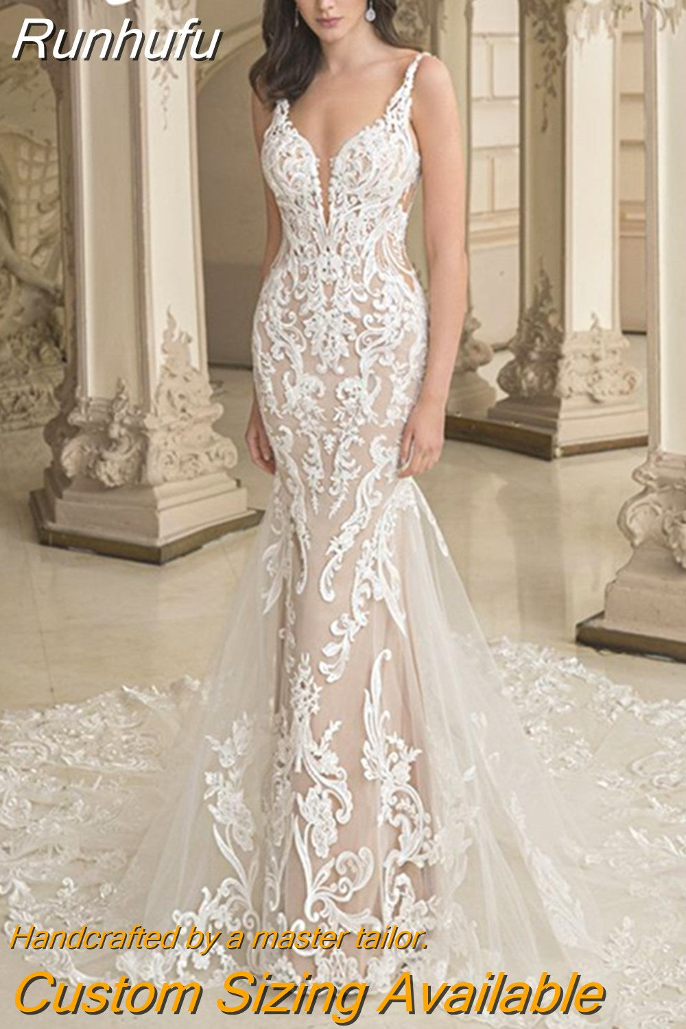 Runhufu Deep V-Neck Wedding Dresses Lace Appliques Sleeveless Sexy Mermaid Bride Gown Backless Zipper Train Vestidos De Noiva