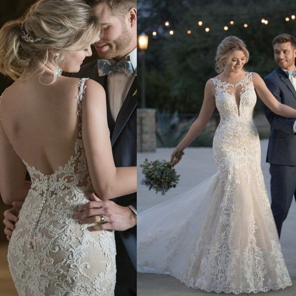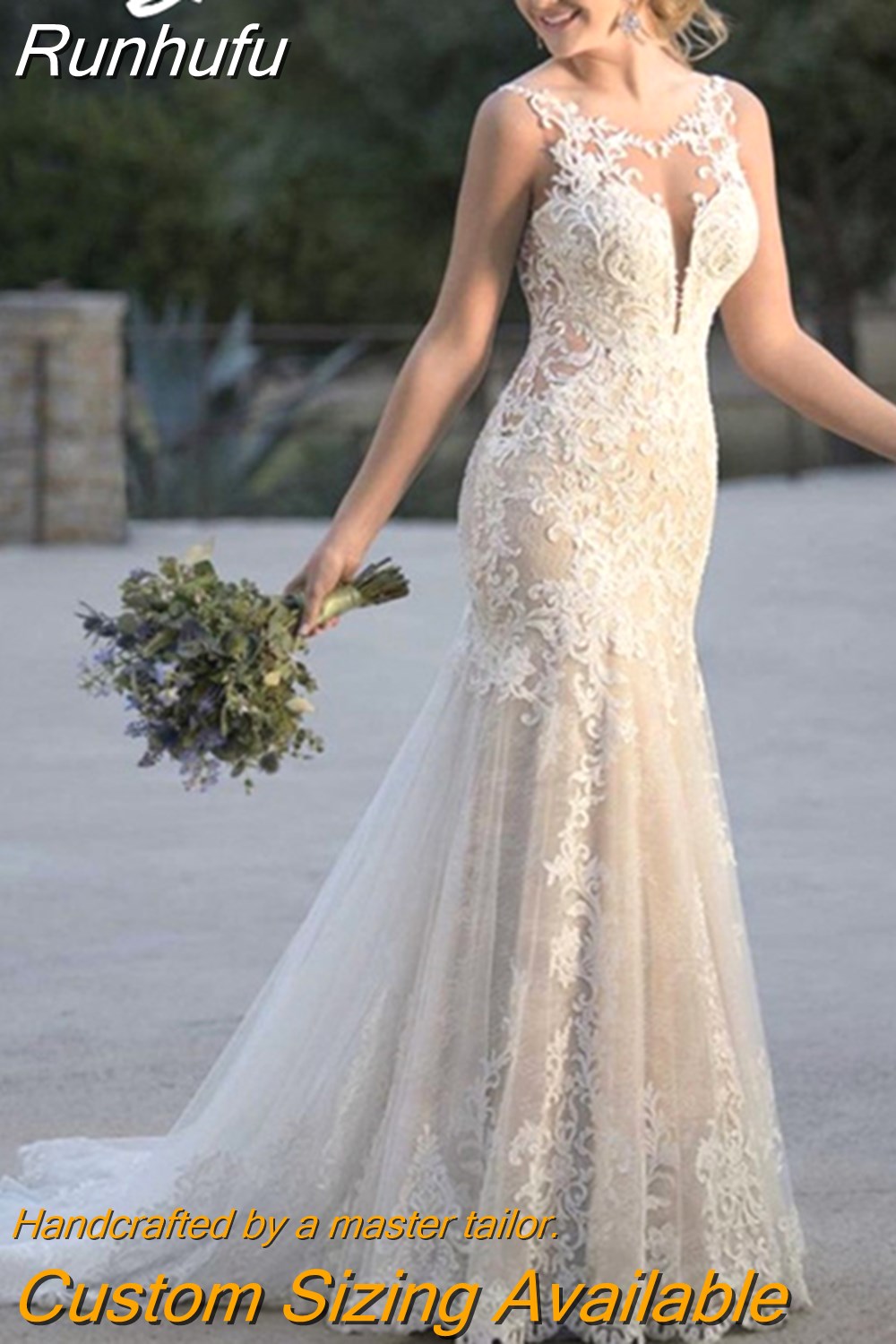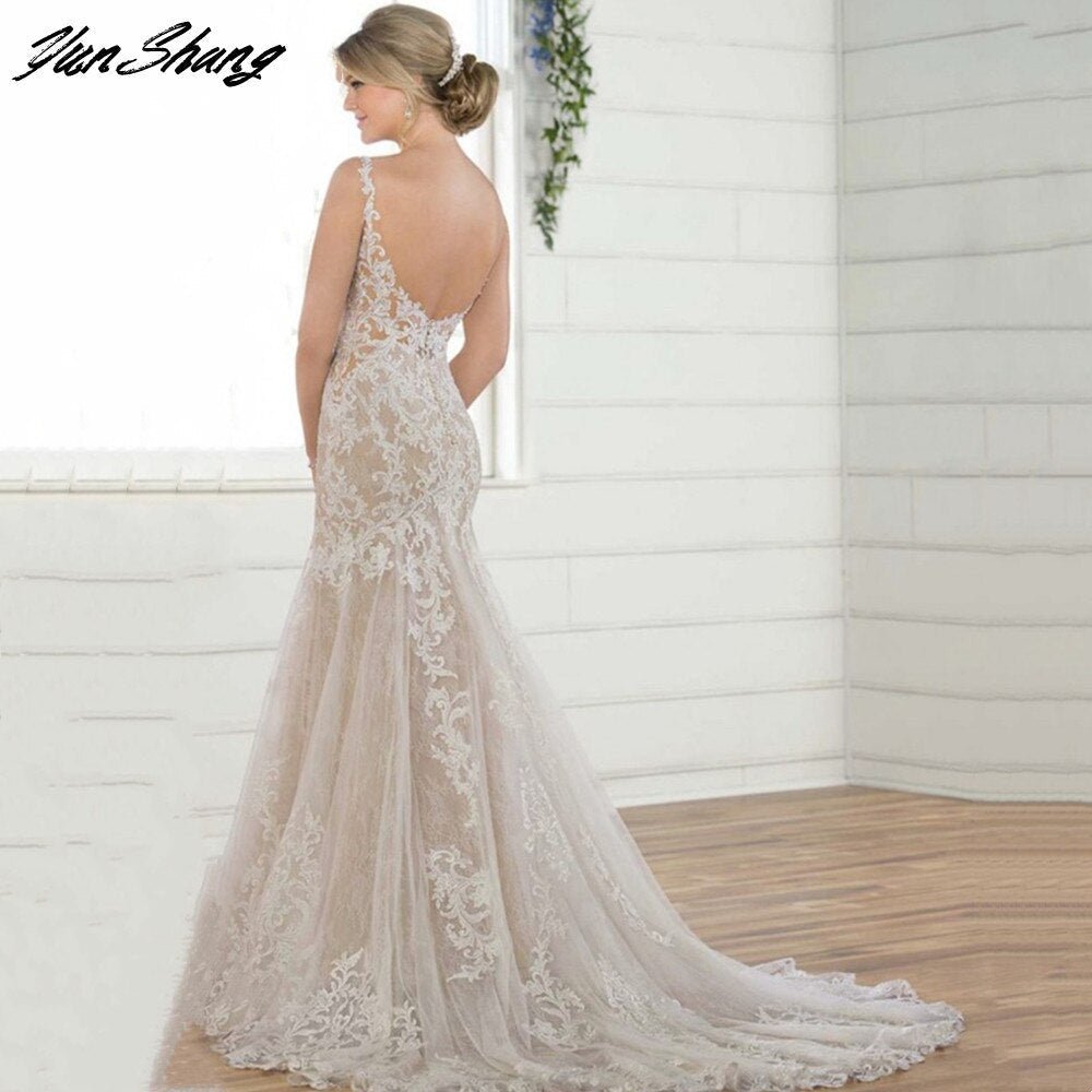 Runhufu Luxury Mermaid Wedding Dress 2023 V-Neck With Train Sexy Backless Bride Gown Lace Applique Sleeveless Vestidos De Noiva
